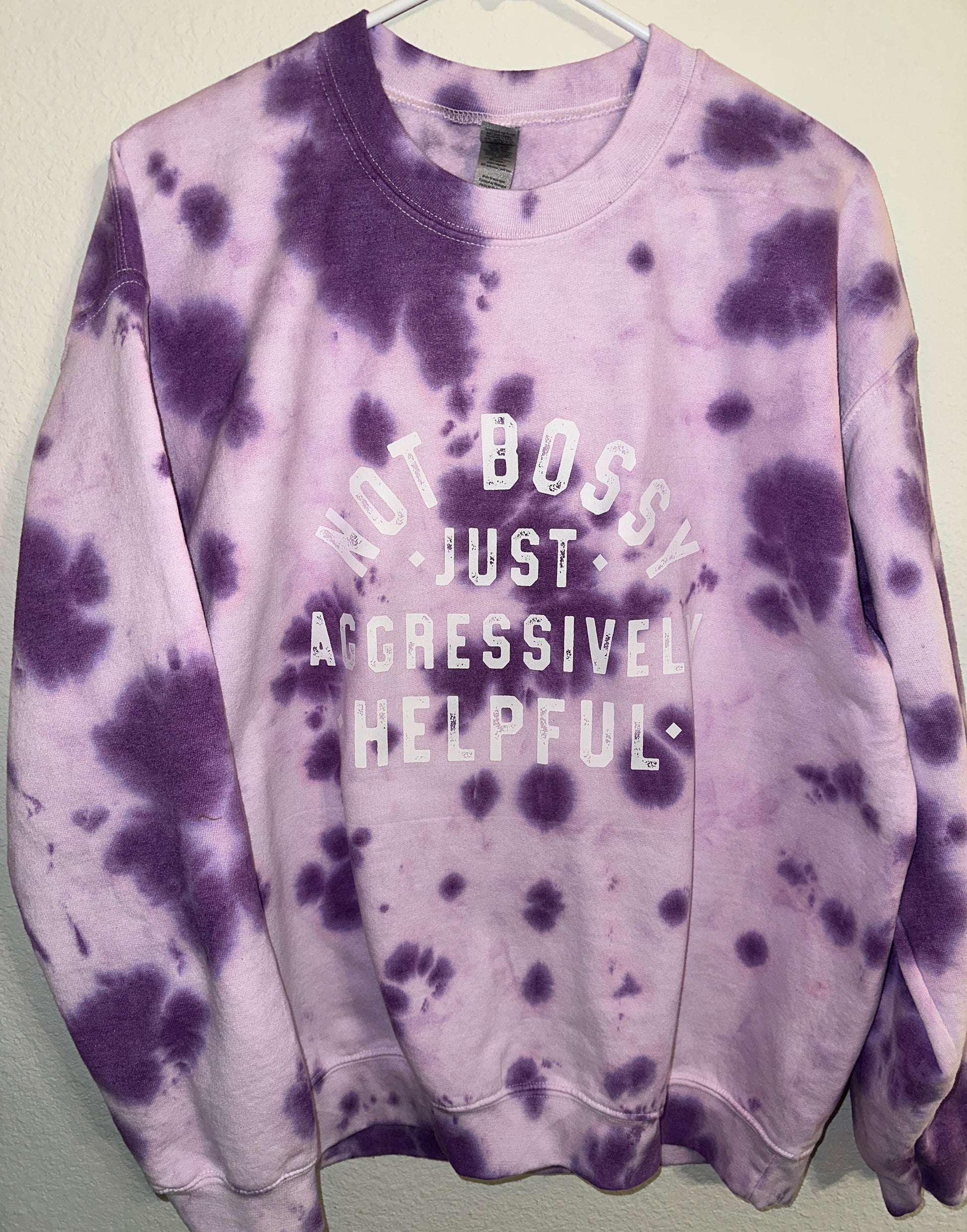 Tie-dyed Gildan crew neck sweatshirt. 50% polyester & 50% cotton.