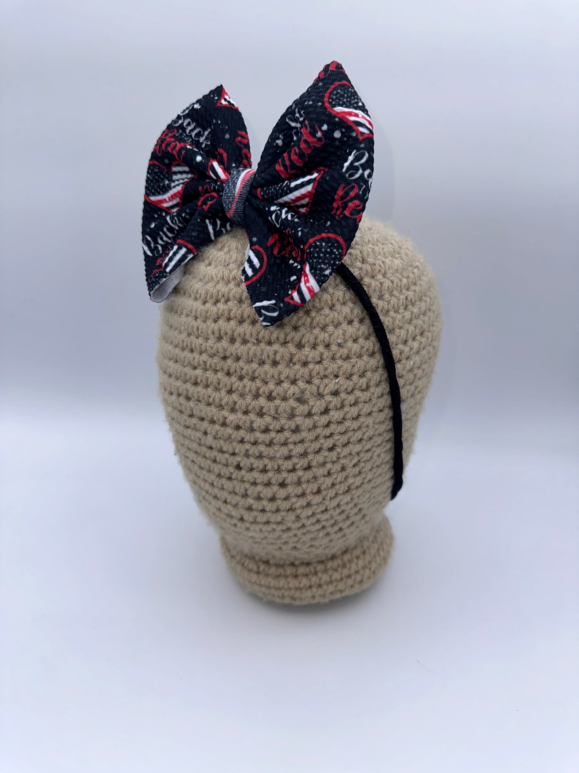 These bows are approximately 5 inches wide. You have the choice of the bow being on a 2.25 inch alligator clip or a stretchy nylon band . The nylon band is a one size fits all.