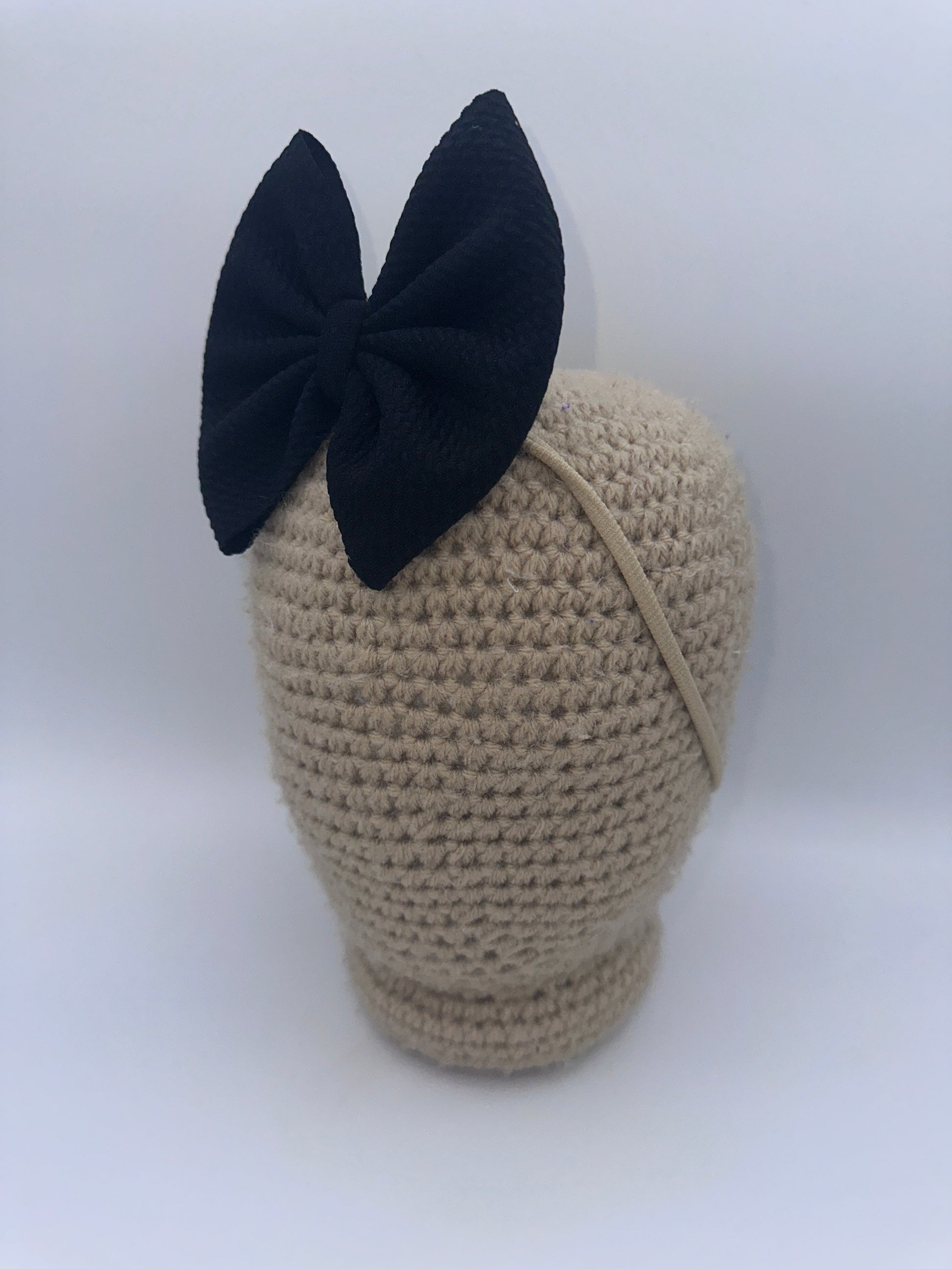 These bows are approximately 5 inches wide. You have the choice of the bow being on a 2.25 inch alligator clip or a stretchy nylon band . The nylon band is a one size fits all.