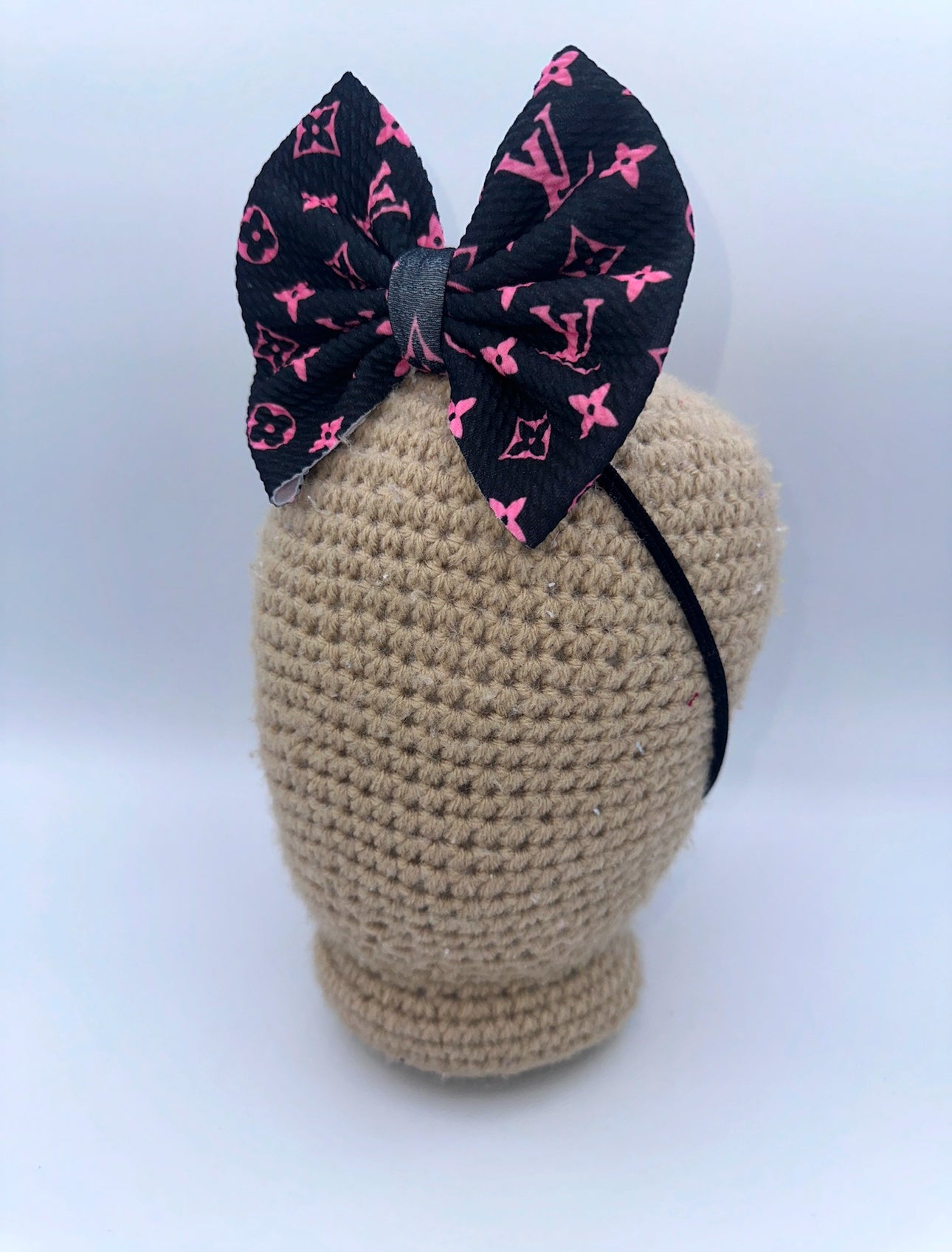 These bows are approximately 5 inches wide. You have the choice of the bow being on a 2.25 inch alligator clip or a stretchy nylon band . The nylon band is a one size fits all.