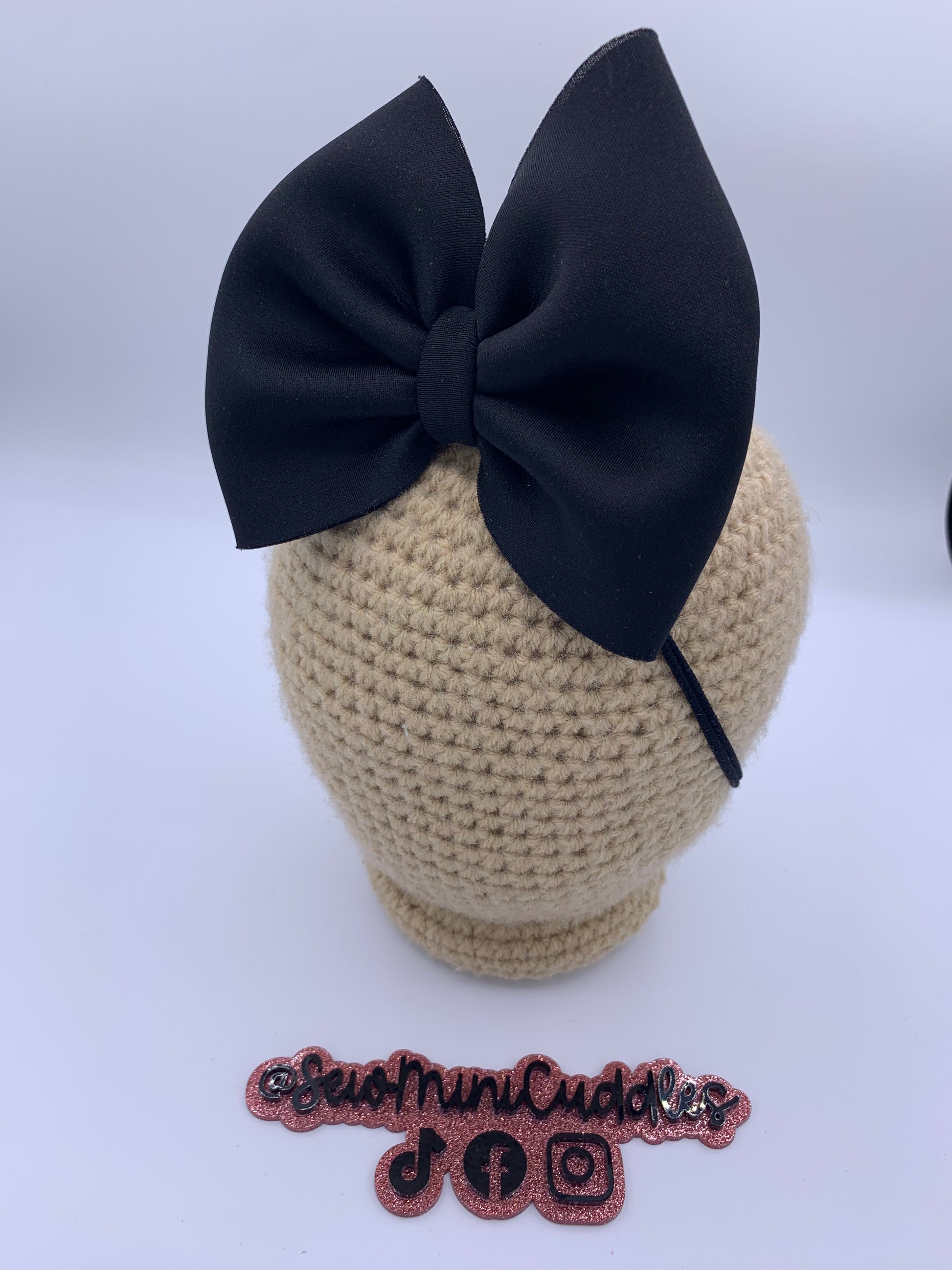 These bows are approximately 5 inches wide. You have the choice of the bow being on a 2.25 inch alligator clip or a stretchy nylon band . The nylon band is a one size fits all.