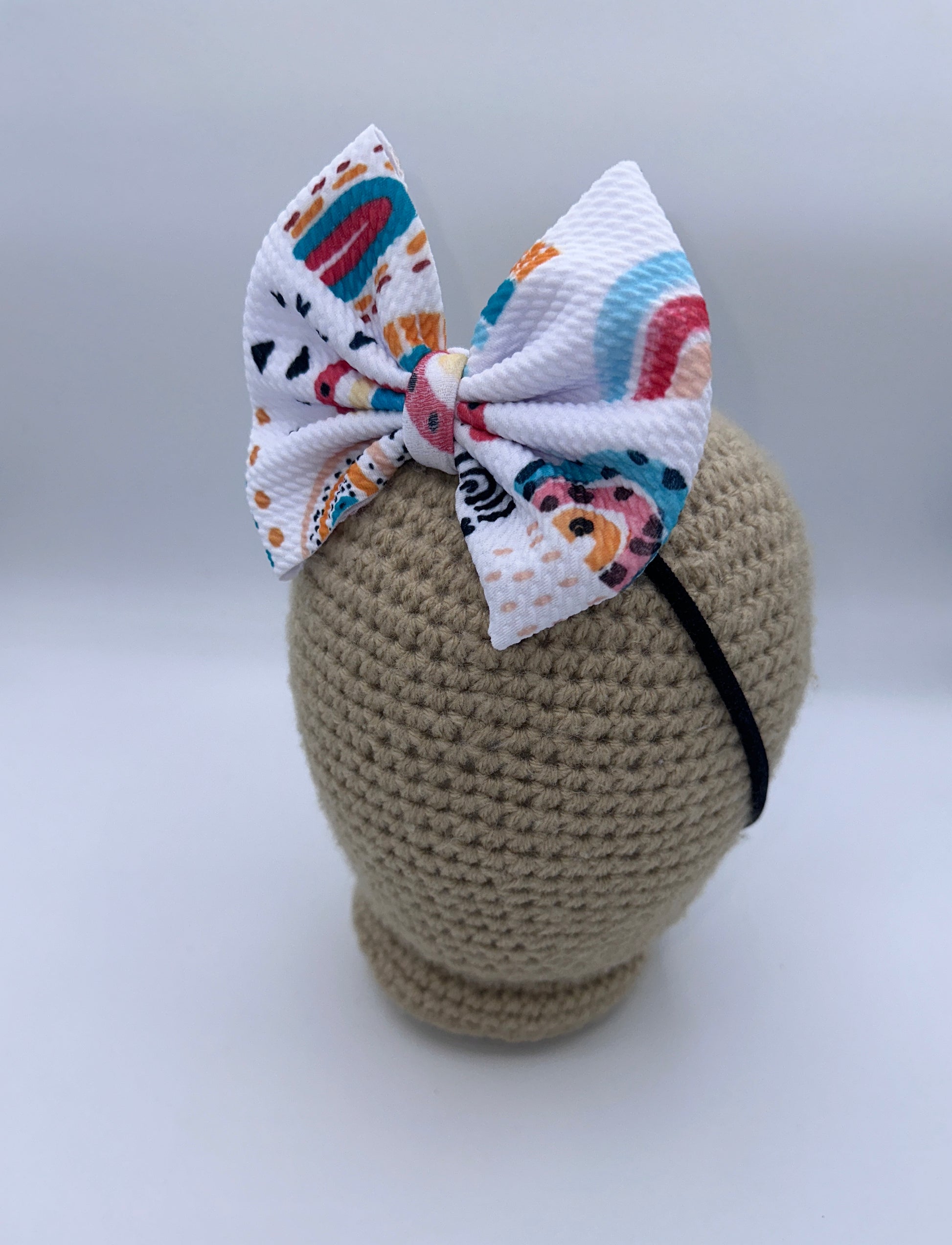 These bows are approximately 5 inches wide. You have the choice of the bow being on a 2.25 inch alligator clip or a stretchy nylon band . The nylon band is a one size fits all.