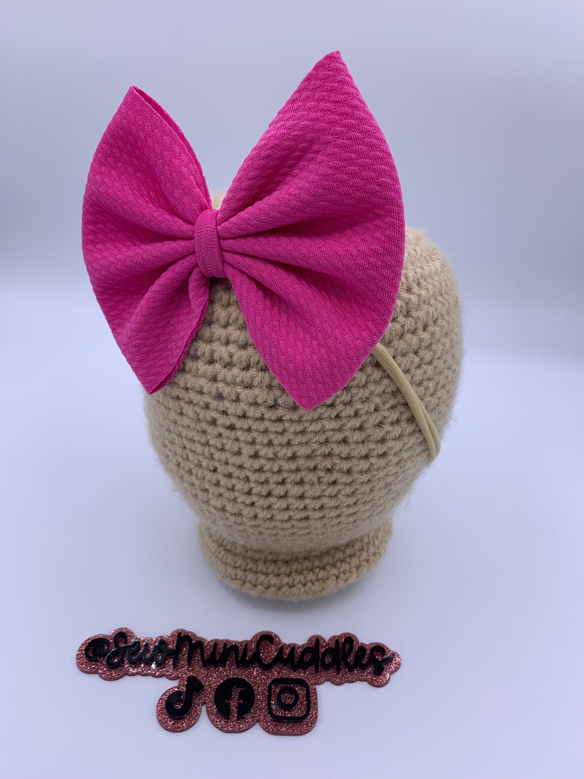 These bows are approximately 5 inches wide. You have the choice of the bow being on a 2.25 inch alligator clip or a stretchy nylon band . The nylon band is a one size fits all.