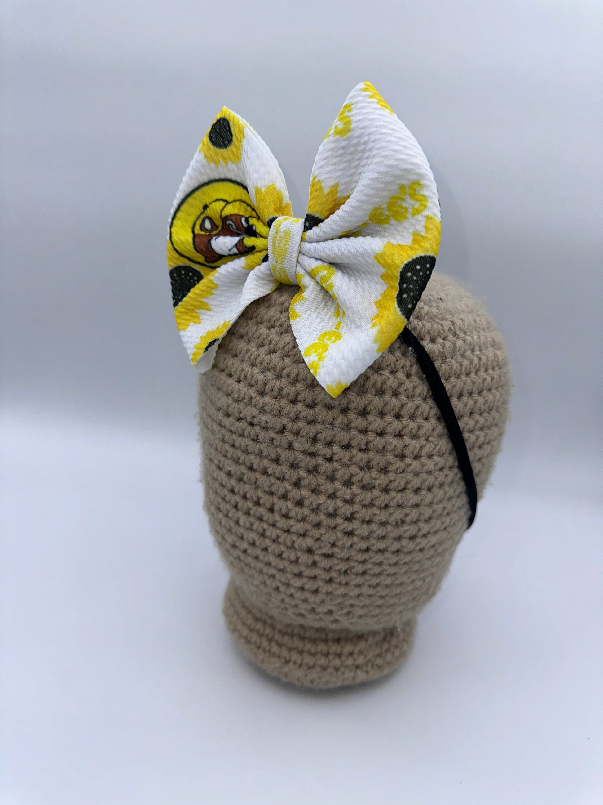These bows are approximately 5 inches wide. You have the choice of the bow being on a 2.25 inch alligator clip or a stretchy nylon band . The nylon band is a one size fits all.