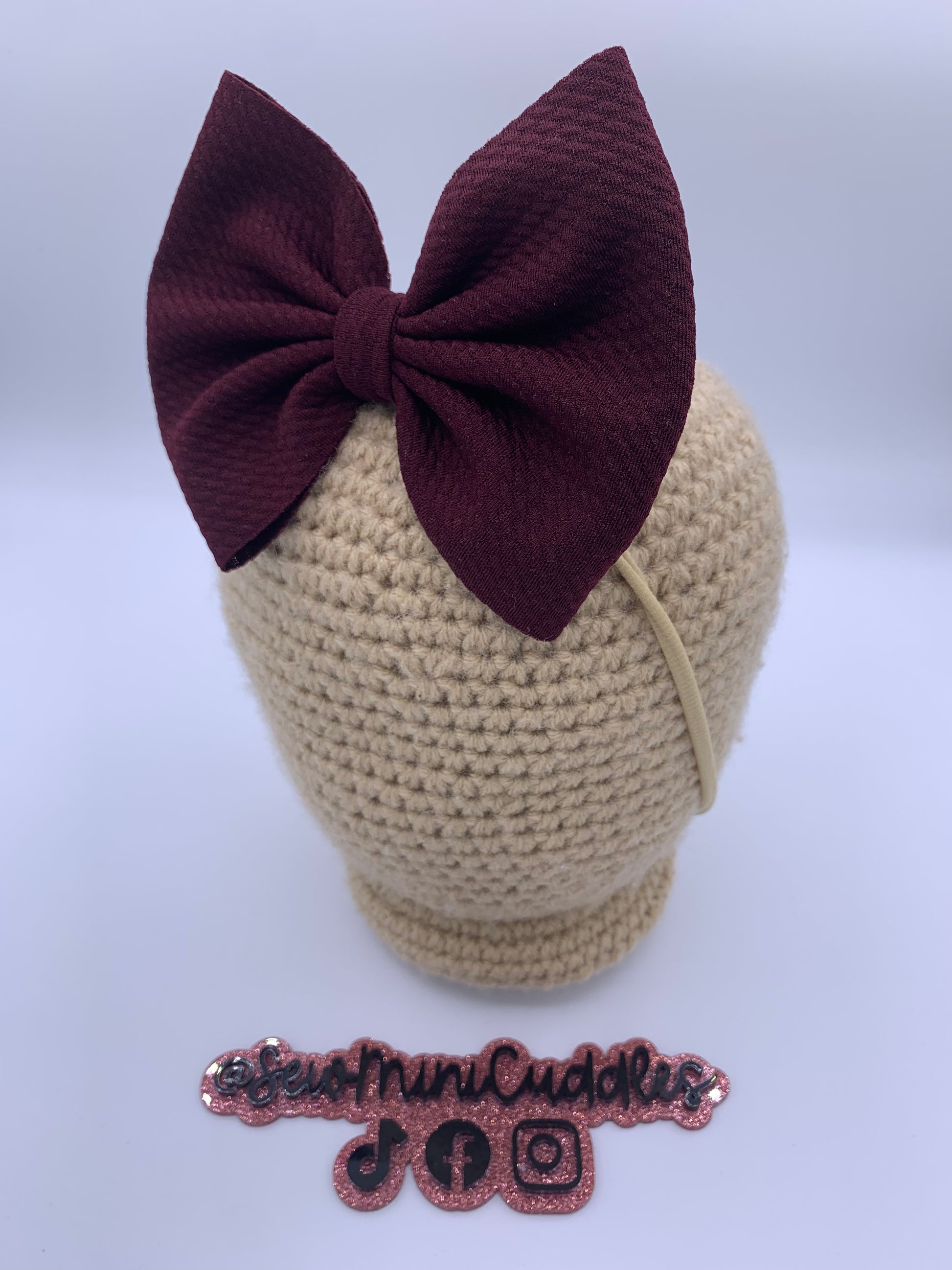 These bows are approximately 5 inches wide. You have the choice of the bow being on a 2.25 inch alligator clip or a stretchy nylon band . The nylon band is a one size fits all.