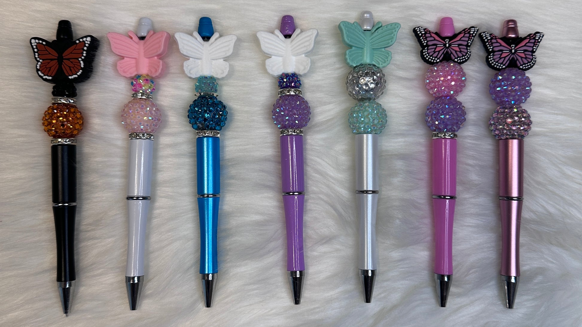 Beaded black ink plastic twist pen. Each pen comes with an additional ink refill.