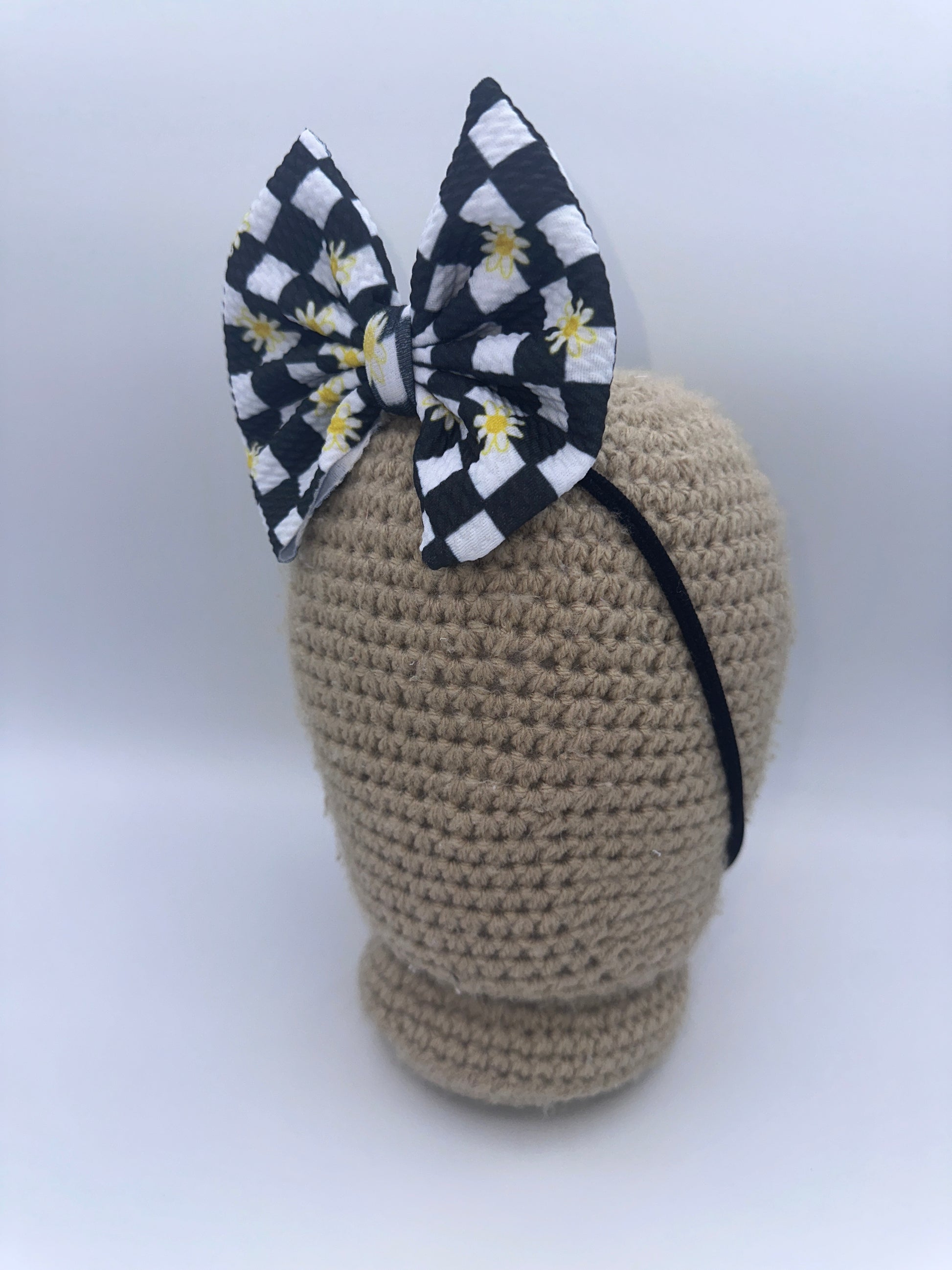 These bows are approximately 5 inches wide. You have the choice of the bow being on a 2.25 inch alligator clip or a stretchy nylon band . The nylon band is a one size fits all.