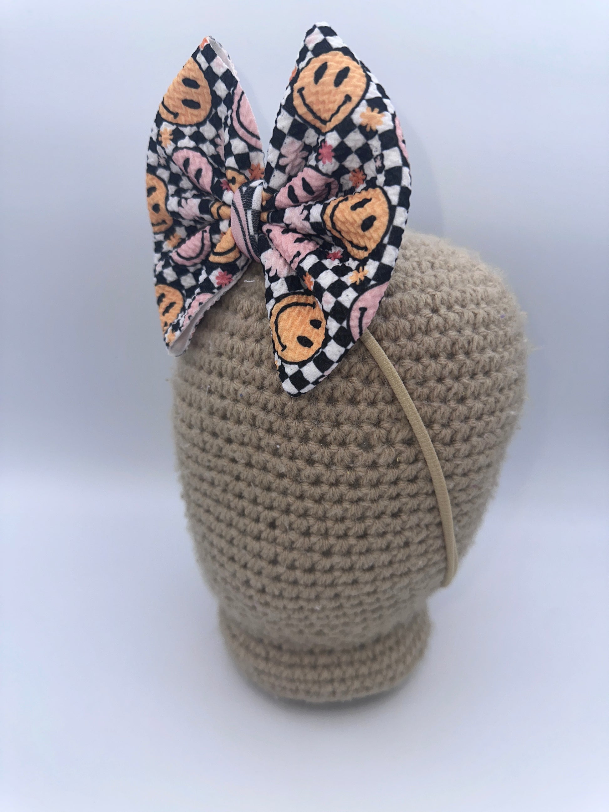 These bows are approximately 5 inches wide. You have the choice of the bow being on a 2.25 inch alligator clip or a stretchy nylon band . The nylon band is a one size fits all.