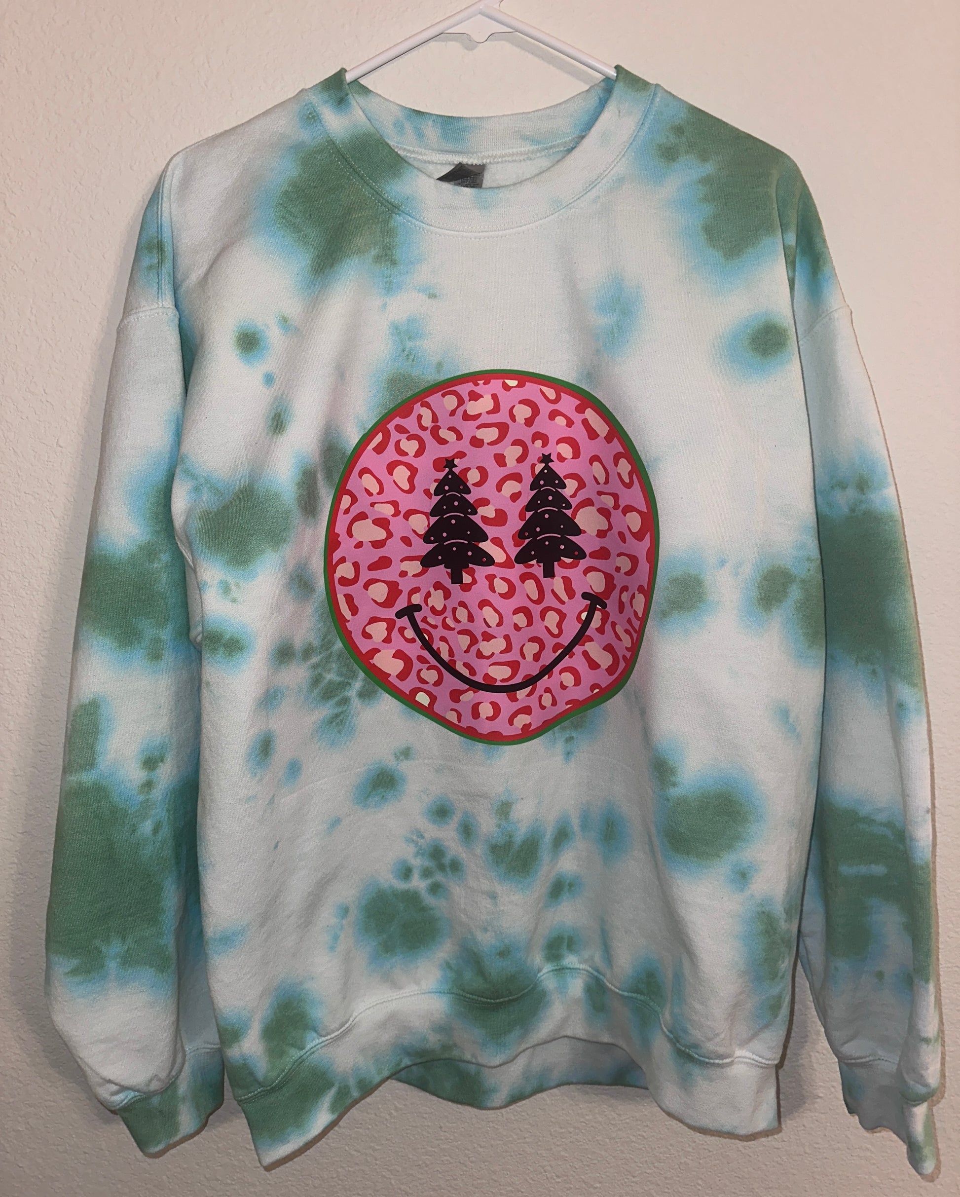 Tie-dyed Gildan crew neck sweatshirt. 50% polyester & 50% cotton.