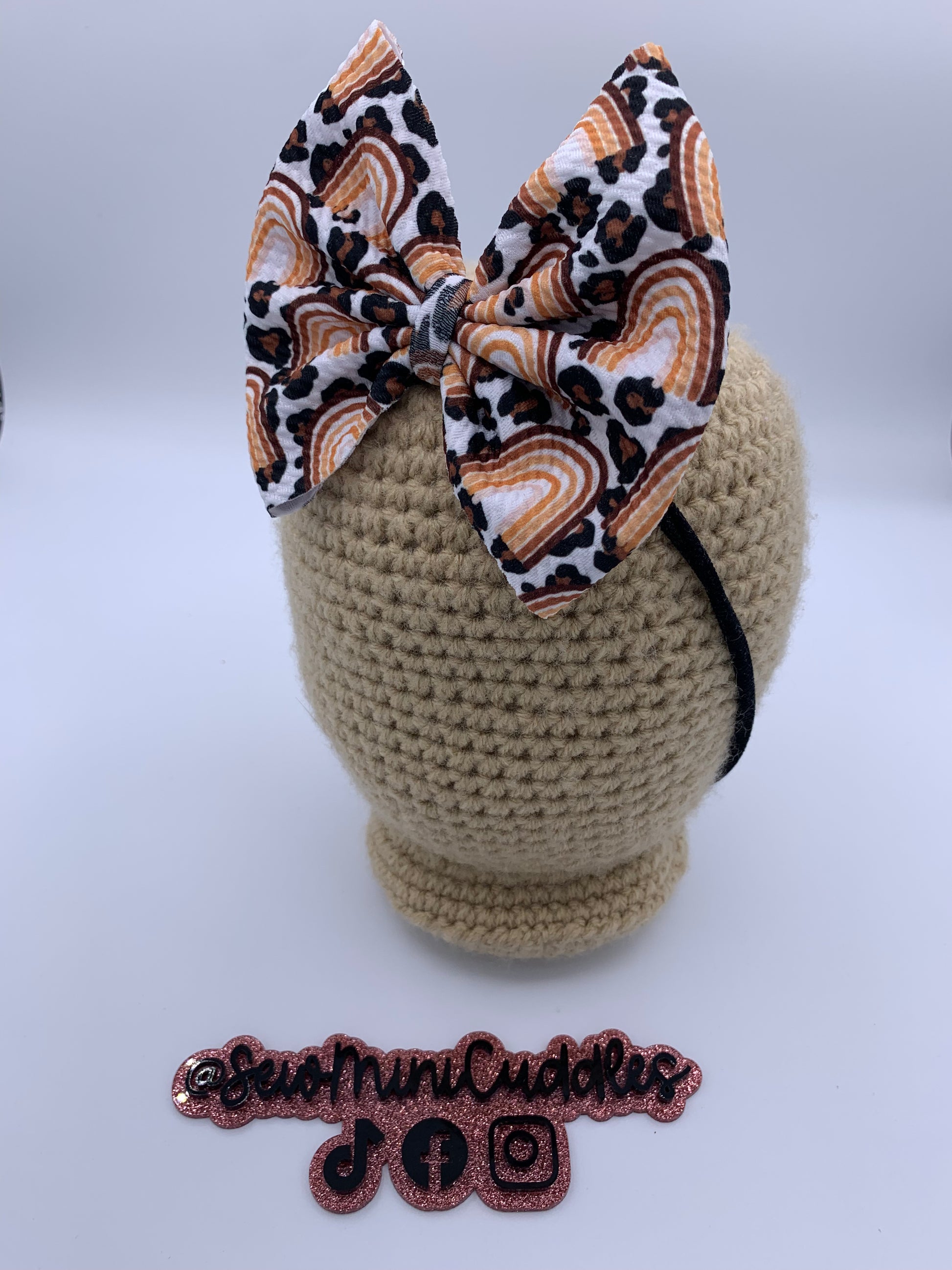 These bows are approximately 5 inches wide. You have the choice of the bow being on a 2.25 inch alligator clip or a stretchy nylon band . The nylon band is a one size fits all.