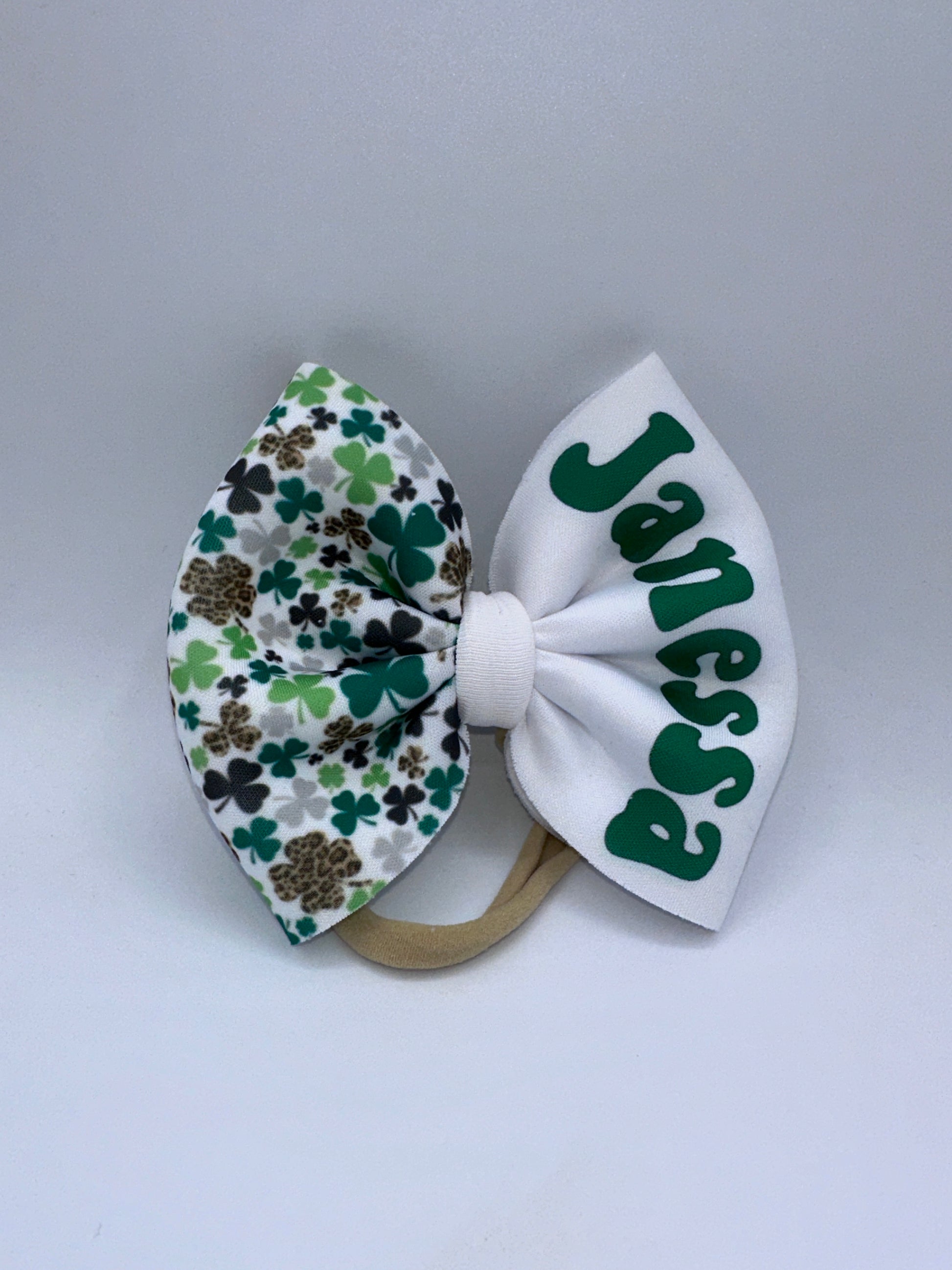 These bows are approximately 5 inches wide. You have the choice of the bow being on a 2.25 inch alligator clip or a stretchy nylon band . The nylon band is a one size fits all.