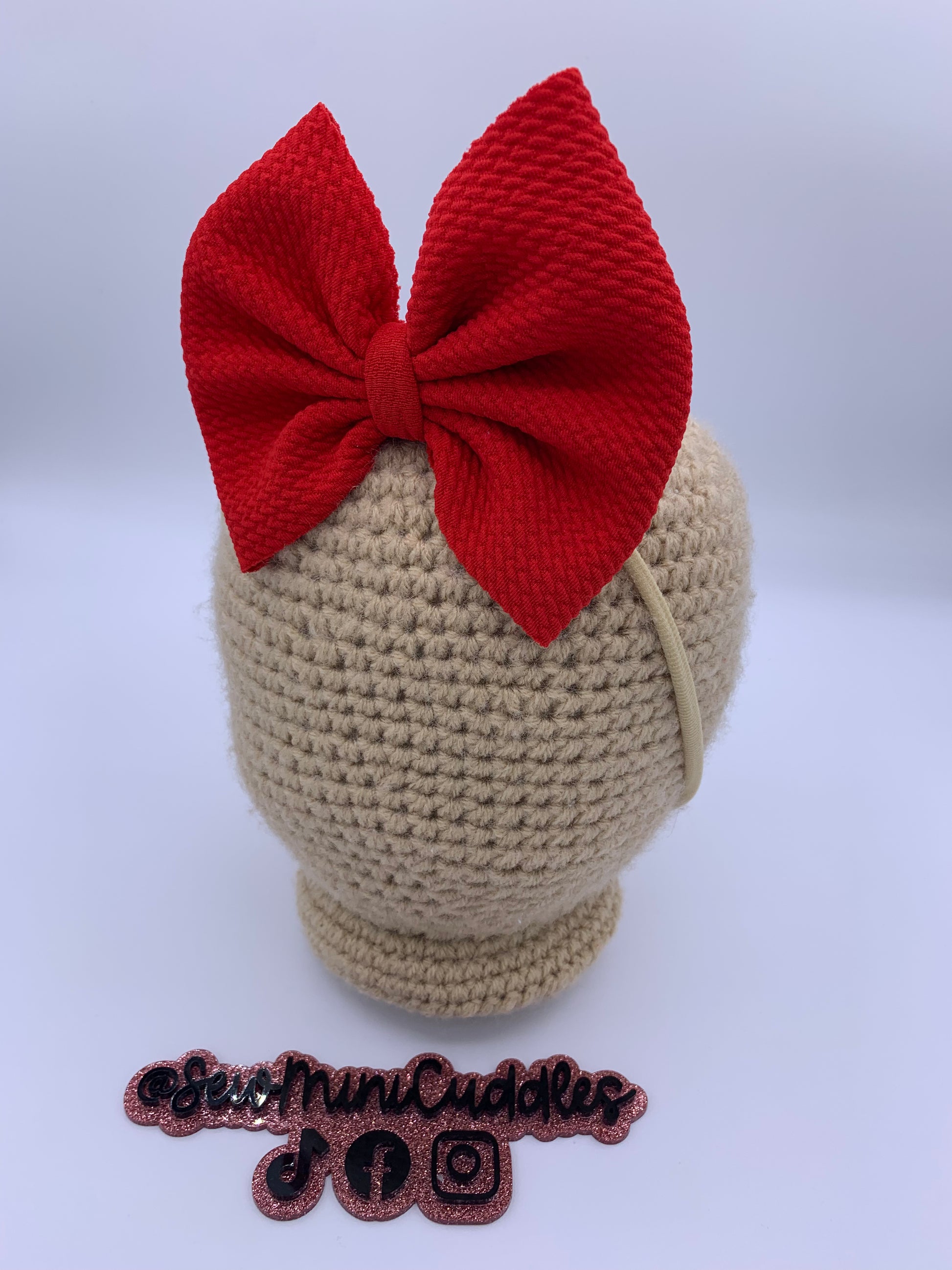 These bows are approximately 5 inches wide. You have the choice of the bow being on a 2.25 inch alligator clip or a stretchy nylon band . The nylon band is a one size fits all.