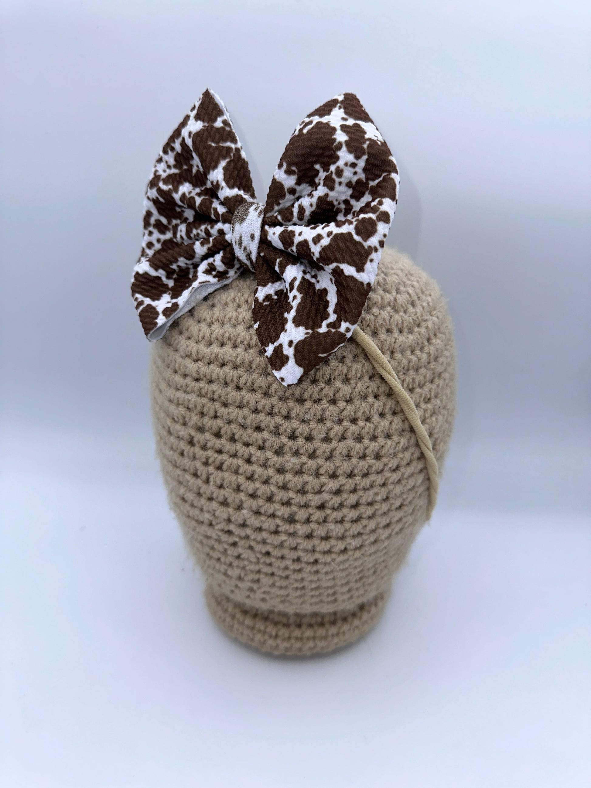 These bows are approximately 5 inches wide. You have the choice of the bow being on a 2.25 inch alligator clip or a stretchy nylon band . The nylon band is a one size fits all.