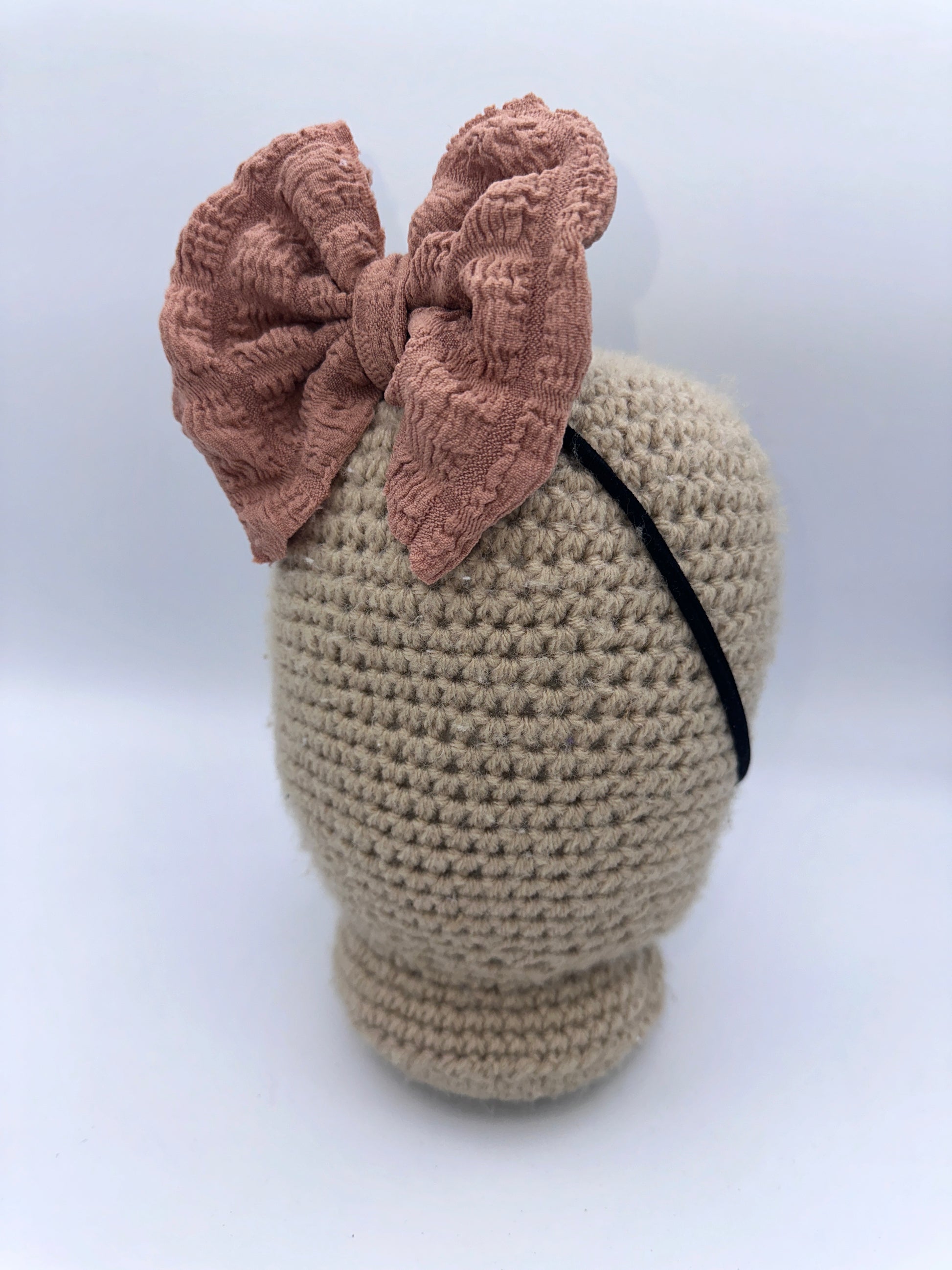 These bows are approximately 5 inches wide. You have the choice of the bow being on a 2.25 inch alligator clip or a stretchy nylon band . The nylon band is a one size fits all.