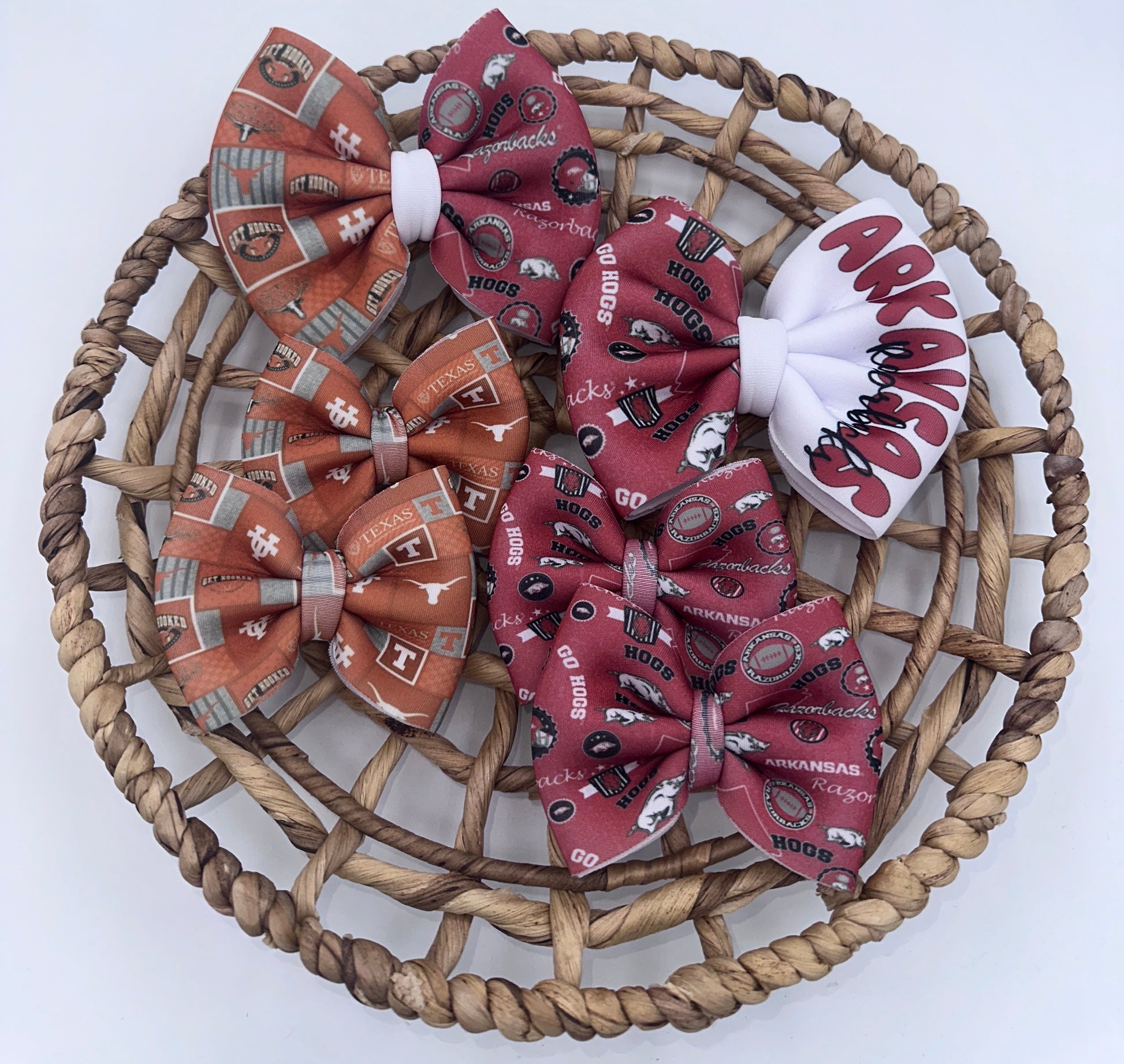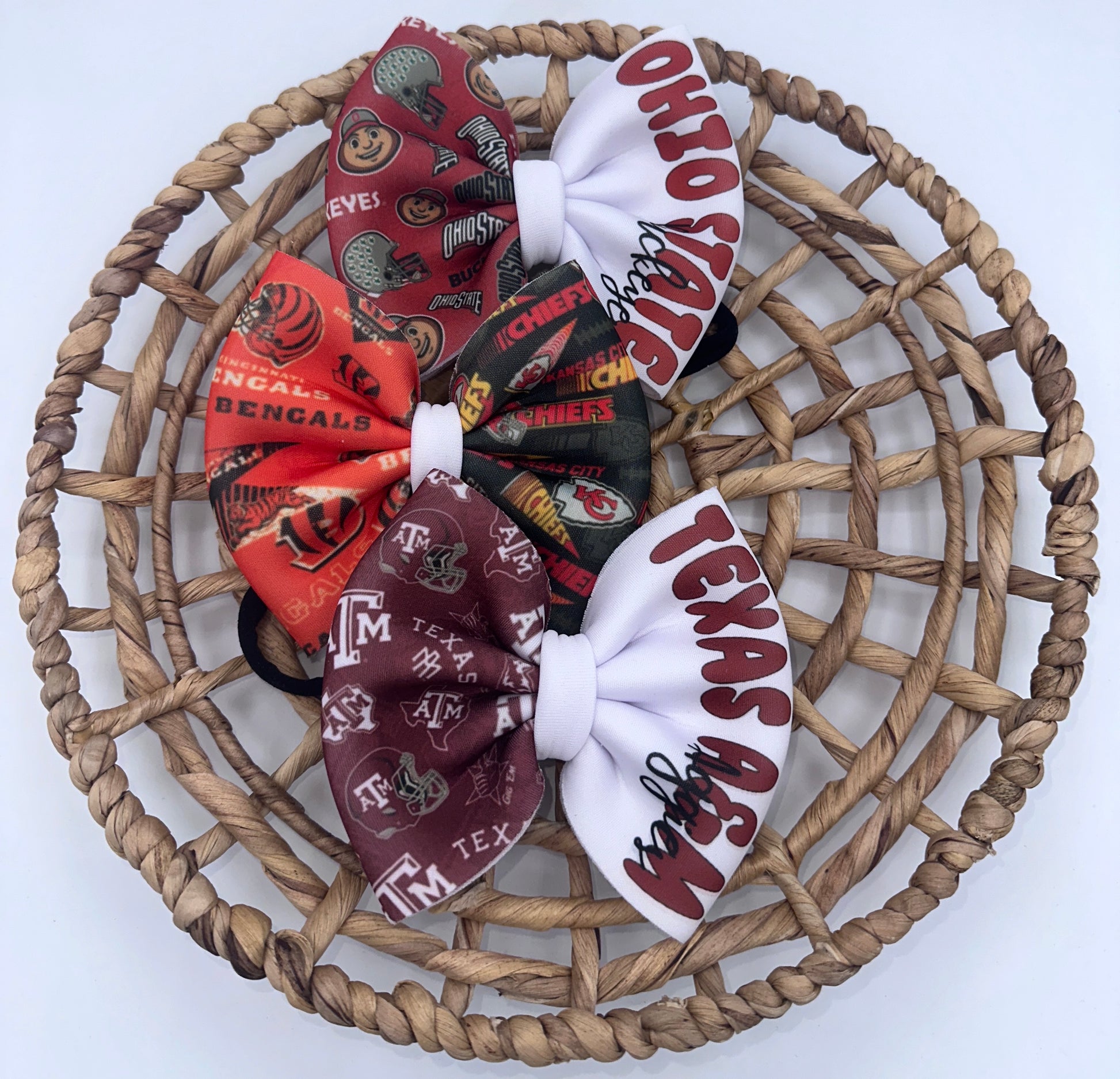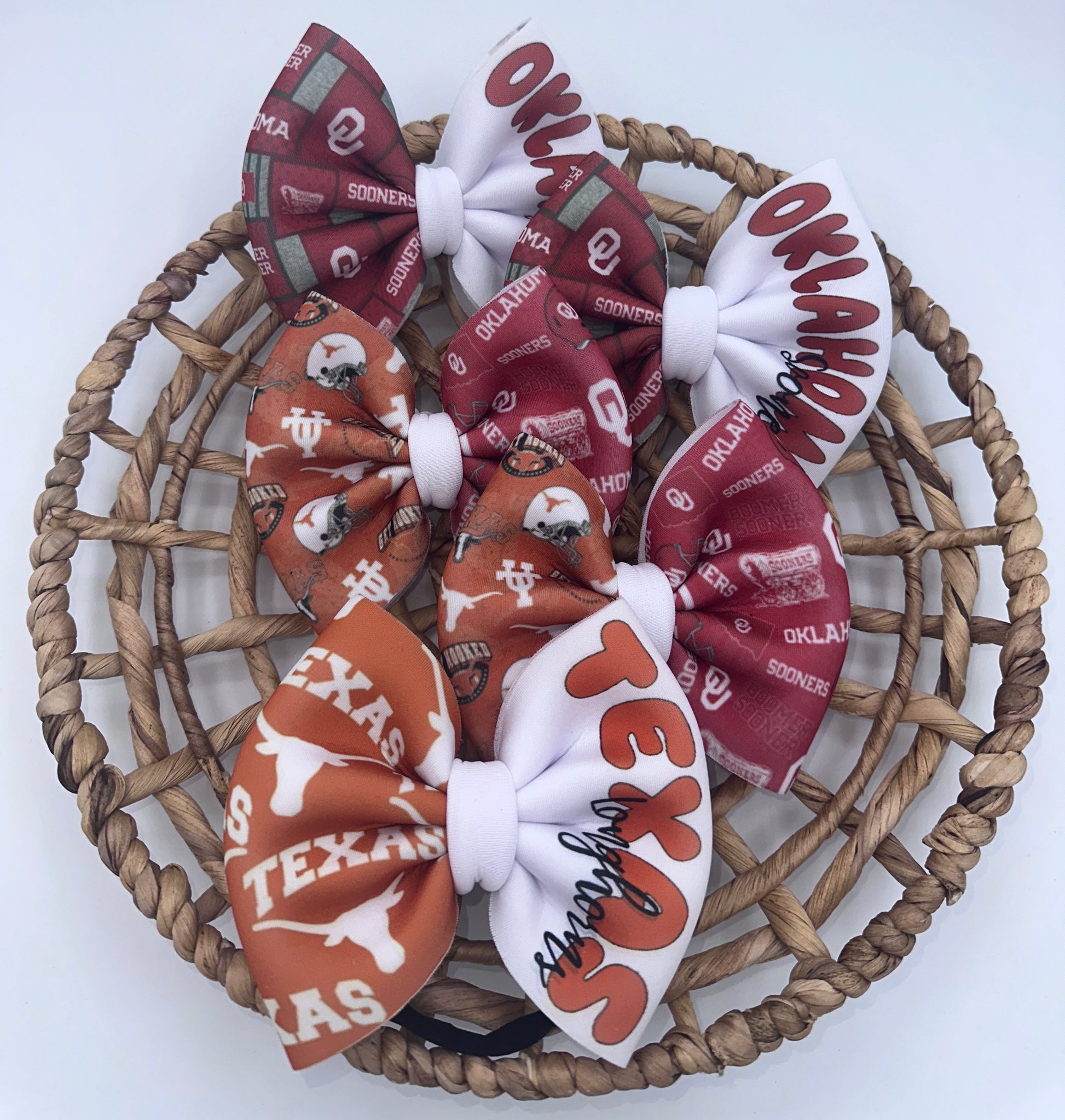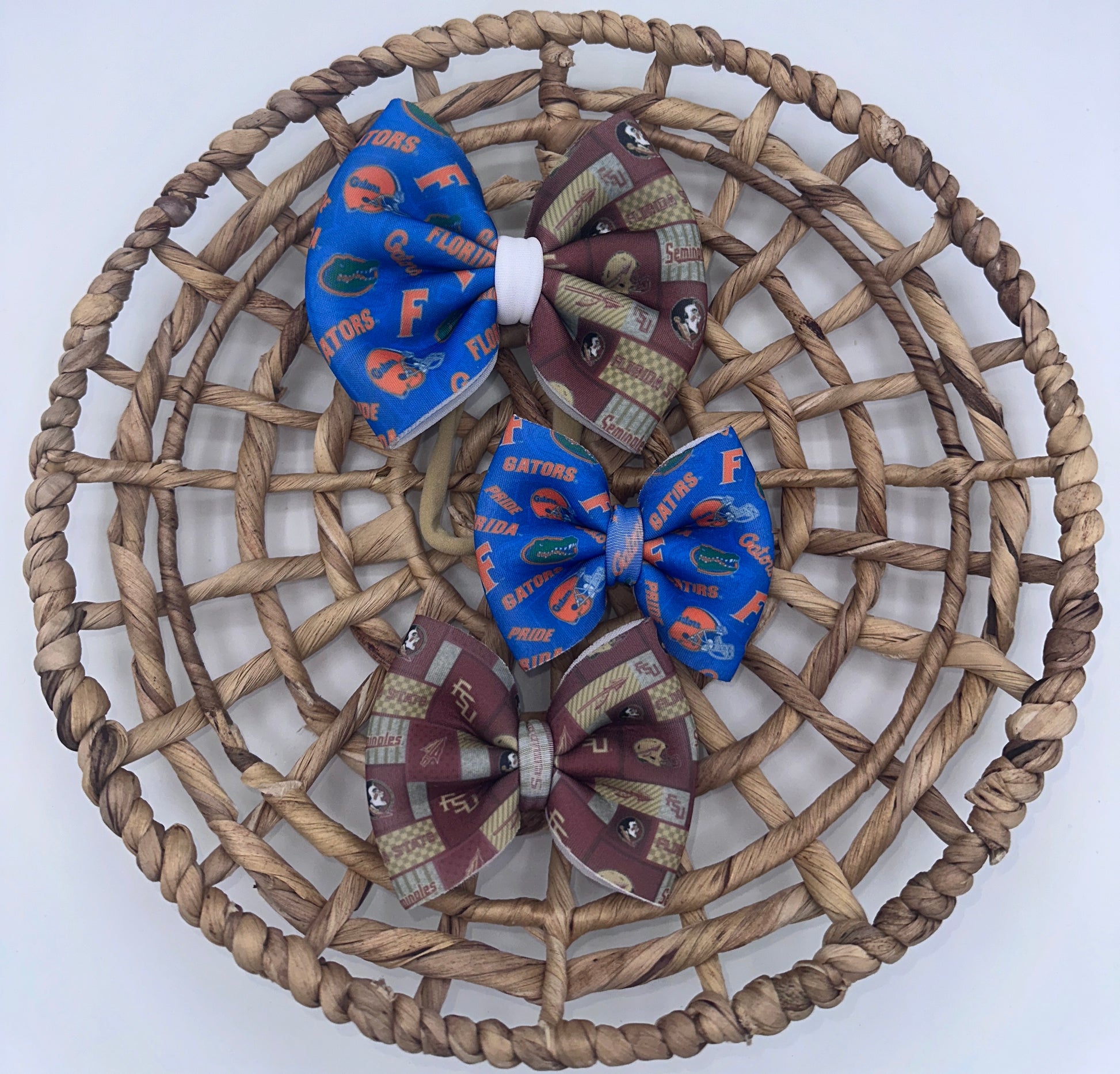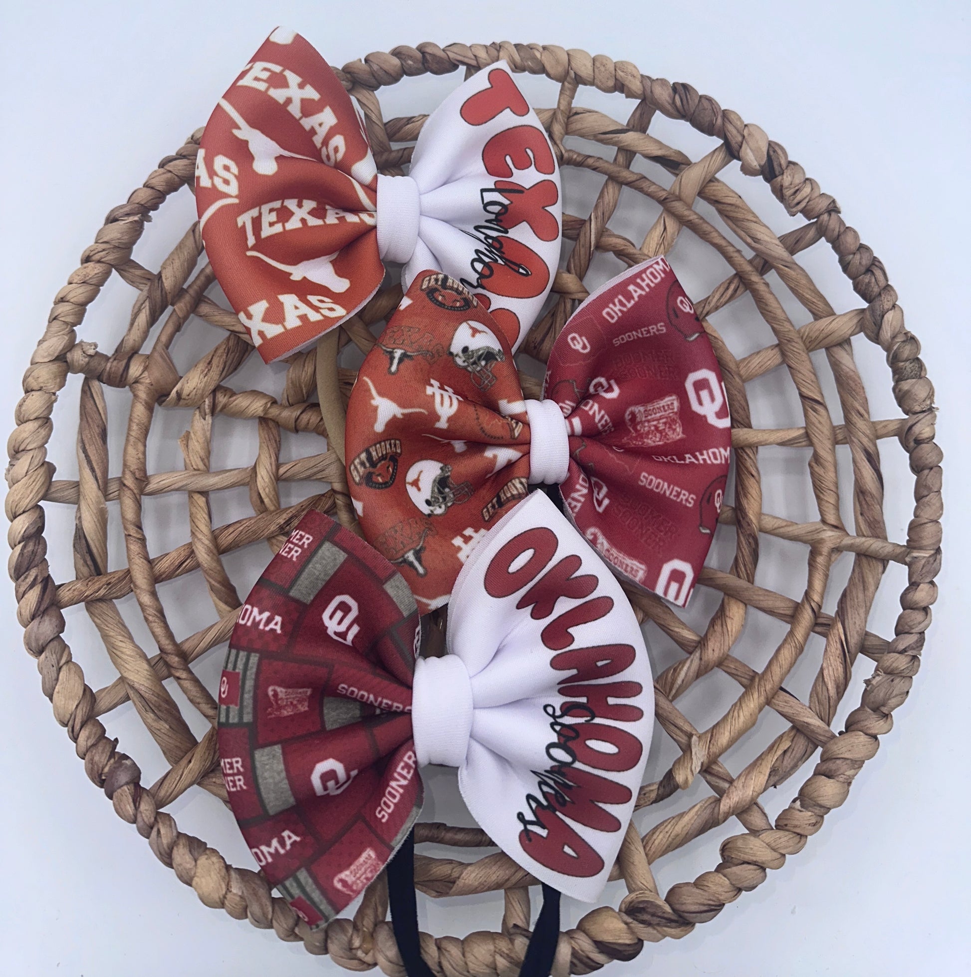These bows are approximately 5 inches wide. You have the choice of the bow being on a 2.25 inch alligator clip or a stretchy nylon band . The nylon band is a one size fits all.