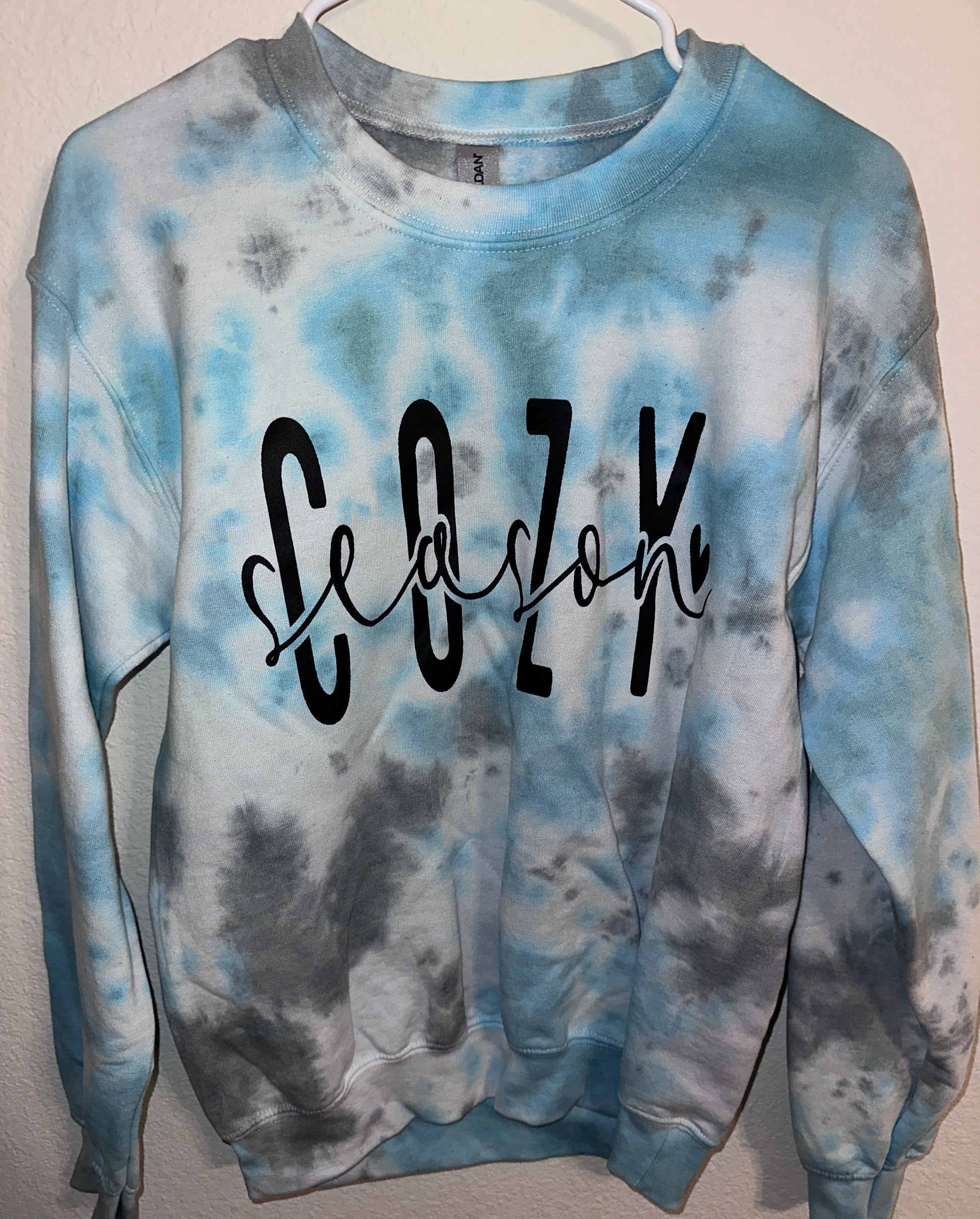 Tie-dyed Gildan crew neck sweatshirt. 50% polyester & 50% cotton.
