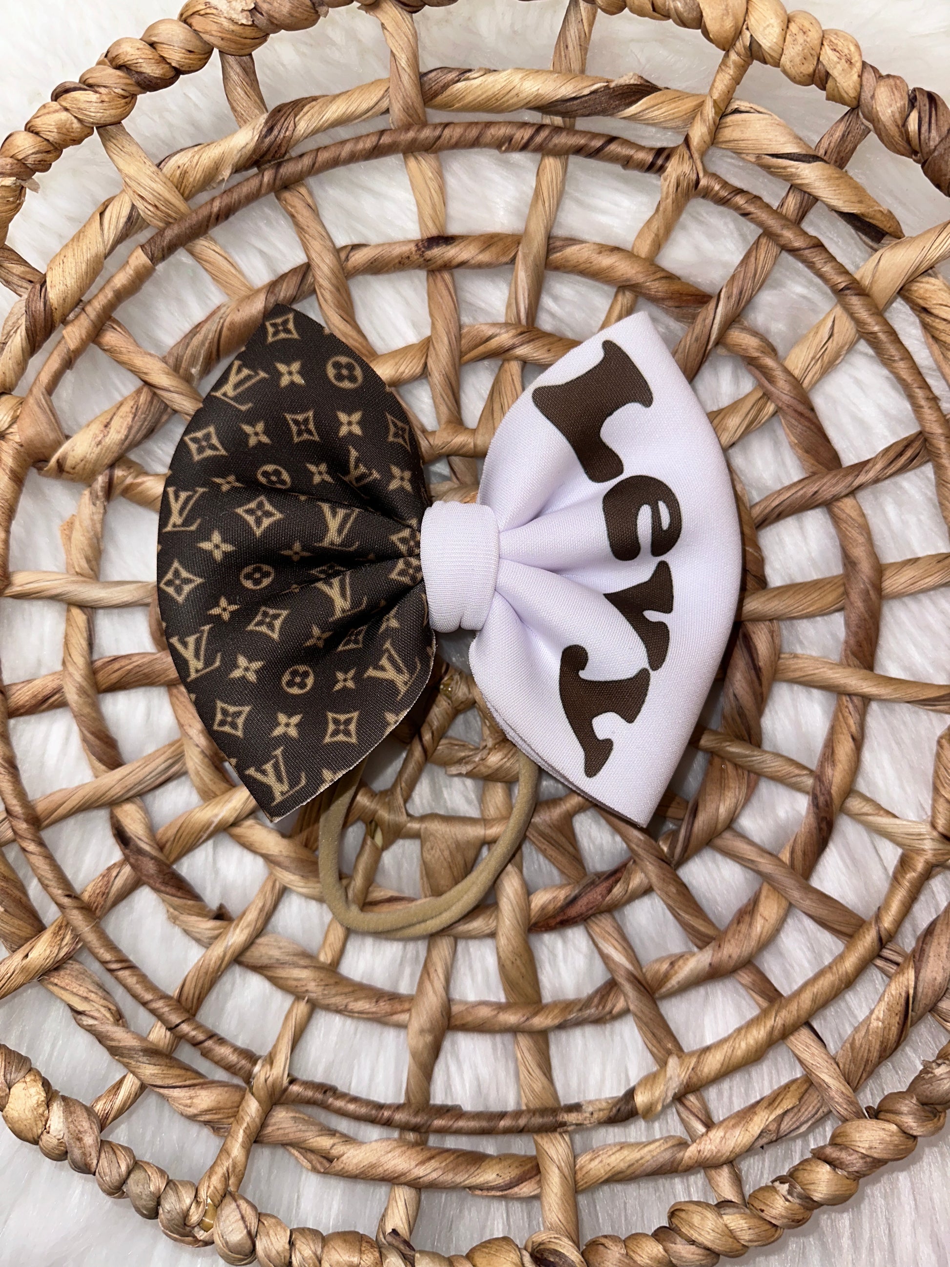 These bows are approximately 5 inches wide. You have the choice of the bow being on a 2.25 inch alligator clip or a stretchy nylon band . The nylon band is a one size fits all.