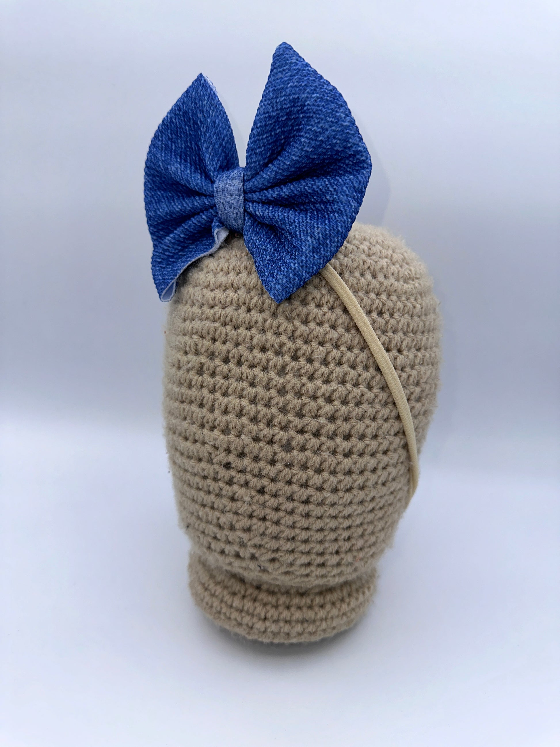 These bows are approximately 5 inches wide. You have the choice of the bow being on a 2.25 inch alligator clip or a stretchy nylon band . The nylon band is a one size fits all.