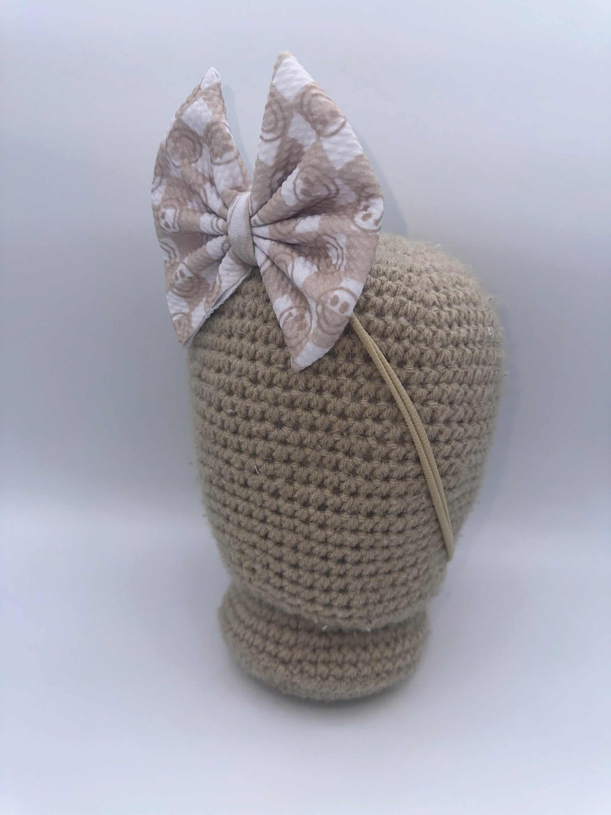 These bows are approximately 5 inches wide. You have the choice of the bow being on a 2.25 inch alligator clip or a stretchy nylon band . The nylon band is a one size fits all.