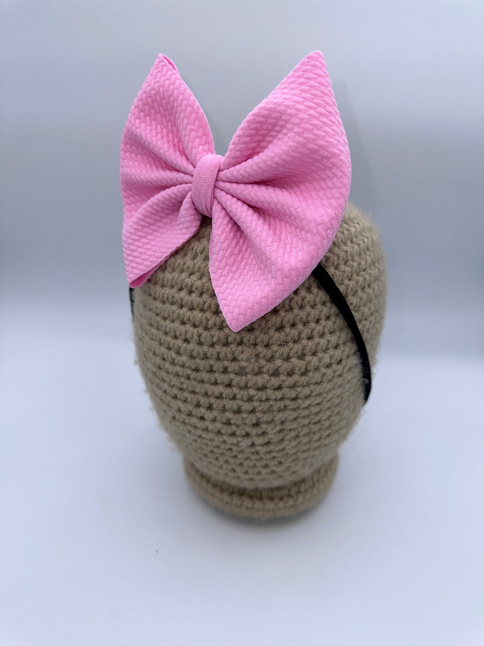 These bows are approximately 5 inches wide. You have the choice of the bow being on a 2.25 inch alligator clip or a stretchy nylon band . The nylon band is a one size fits all.