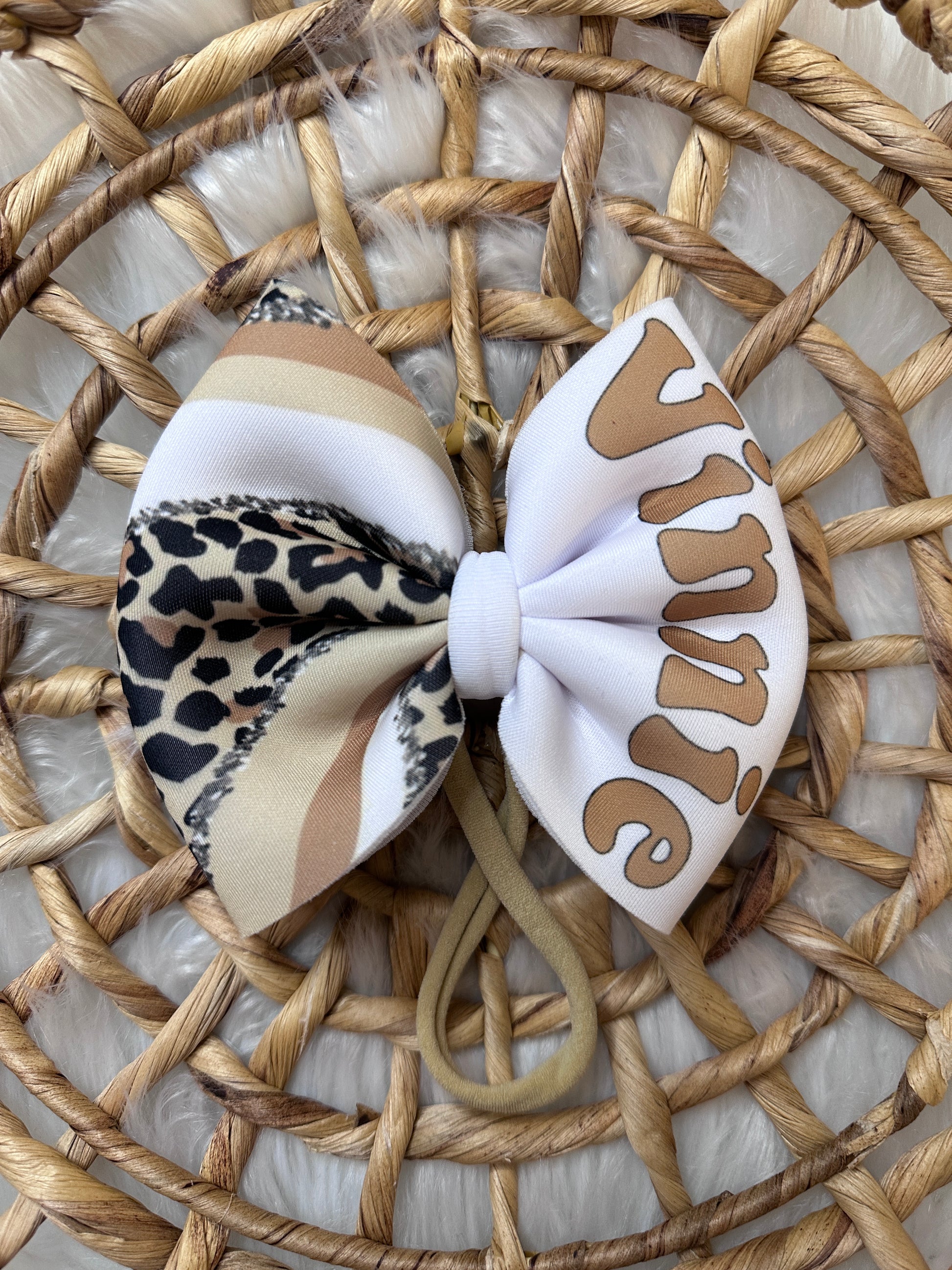 These bows are approximately 5 inches wide. You have the choice of the bow being on a 2.25 inch alligator clip or a stretchy nylon band . The nylon band is a one size fits all.