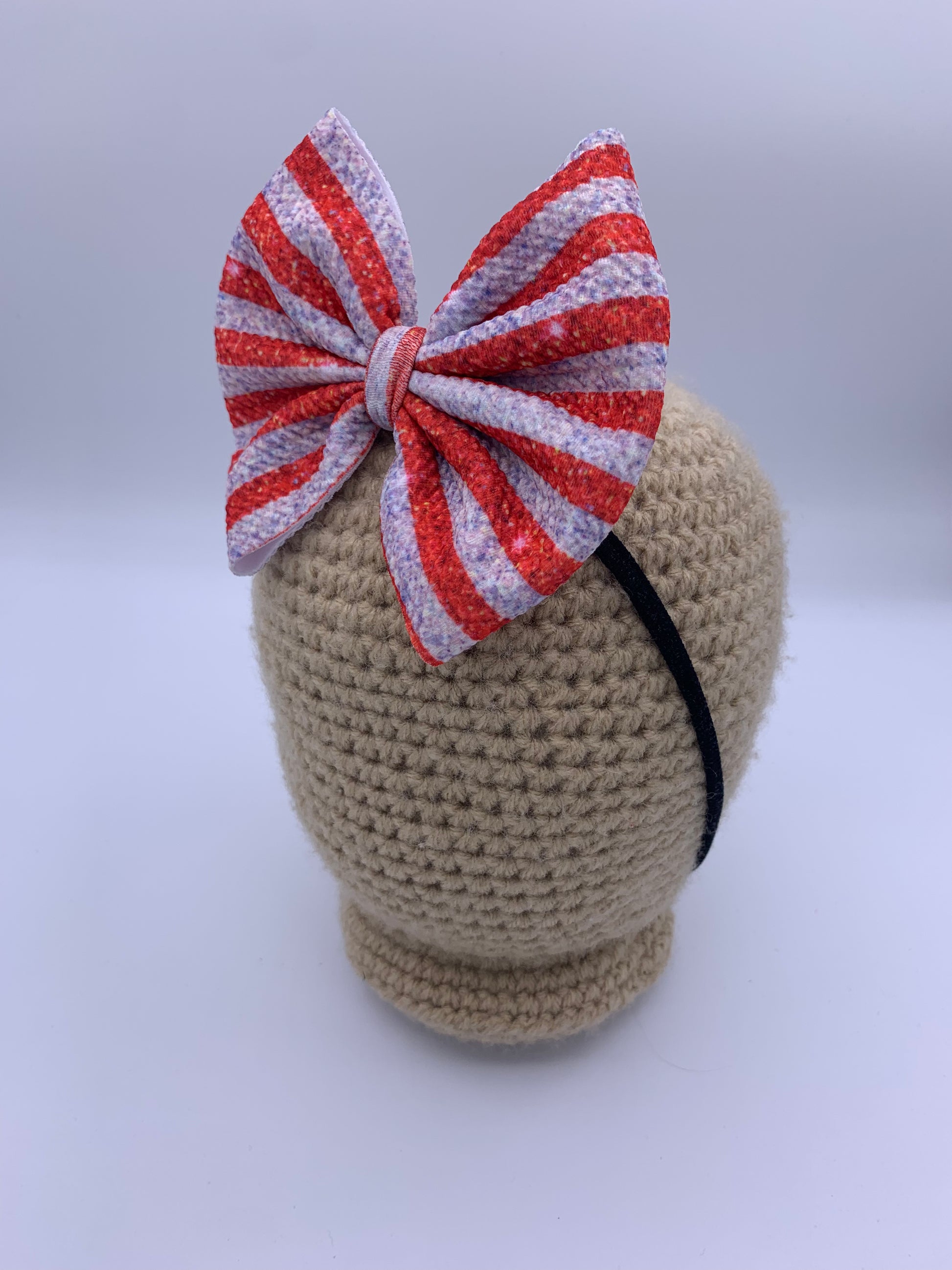 These bows are approximately 5 inches wide. You have the choice of the bow being on a 2.25 inch alligator clip or a stretchy nylon band . The nylon band is a one size fits all.