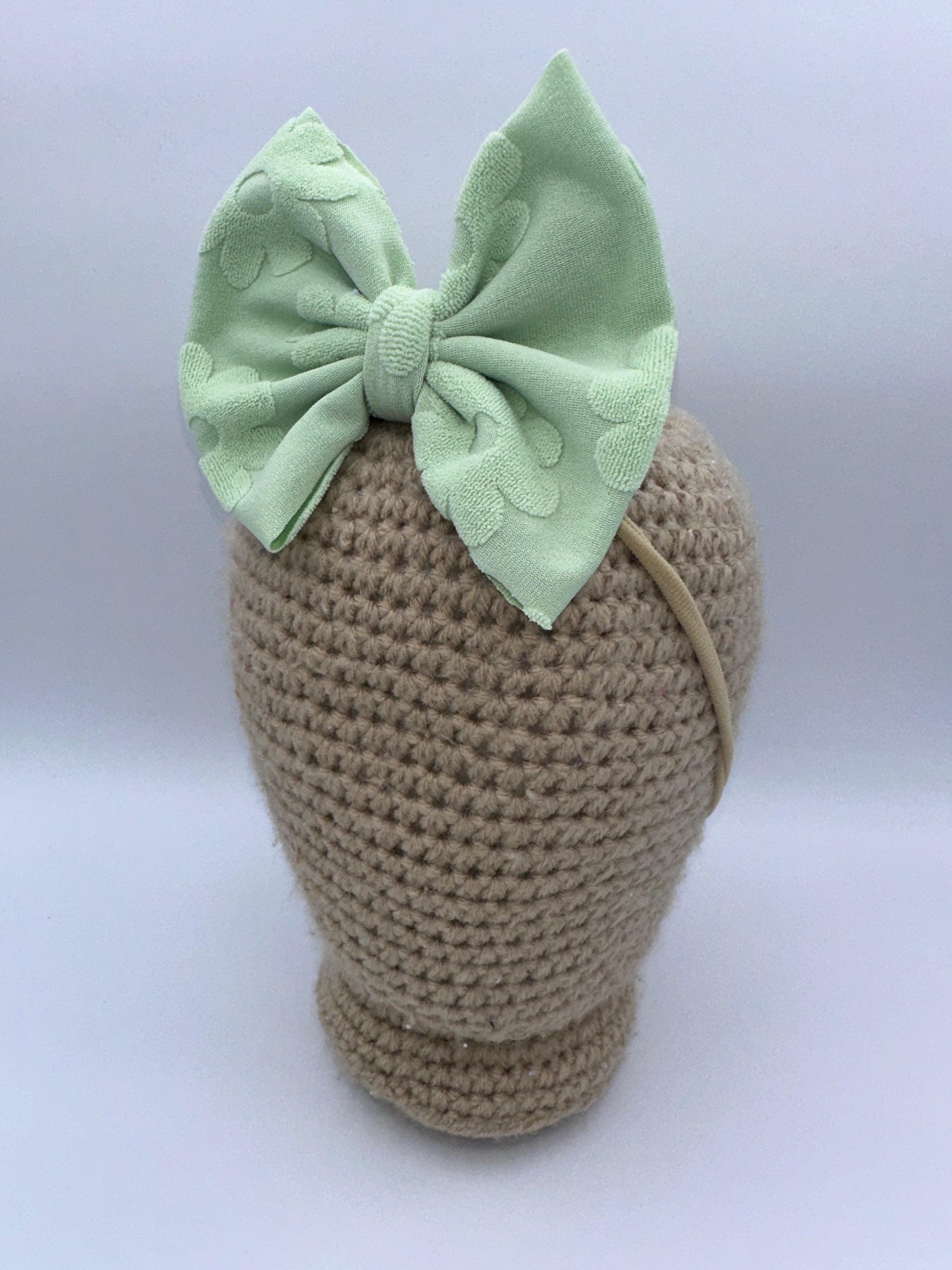 These bows are approximately 5 inches wide. You have the choice of the bow being on a 2.25 inch alligator clip or a stretchy nylon band . The nylon band is a one size fits all.