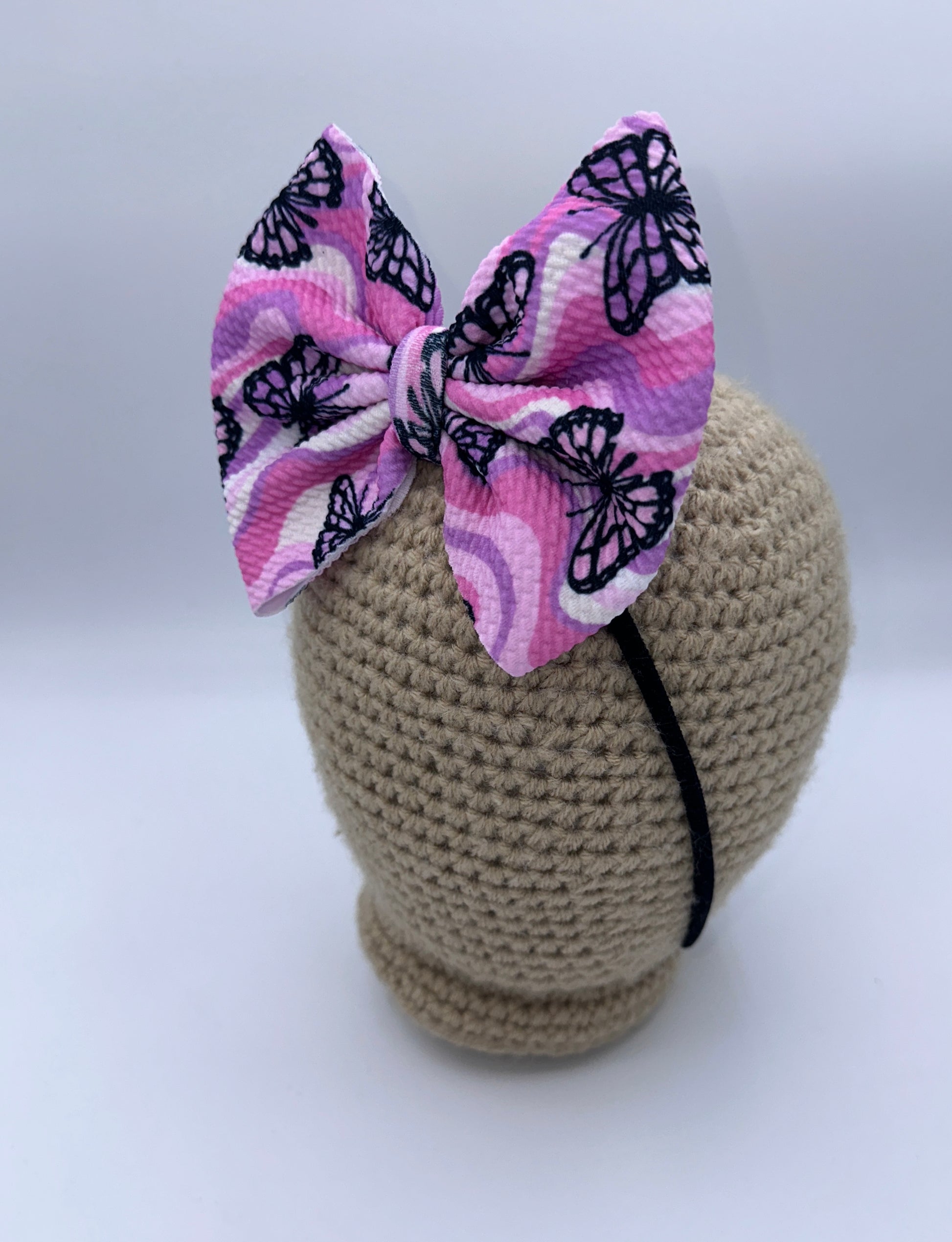 These bows are approximately 5 inches wide. You have the choice of the bow being on a 2.25 inch alligator clip or a stretchy nylon band . The nylon band is a one size fits all.