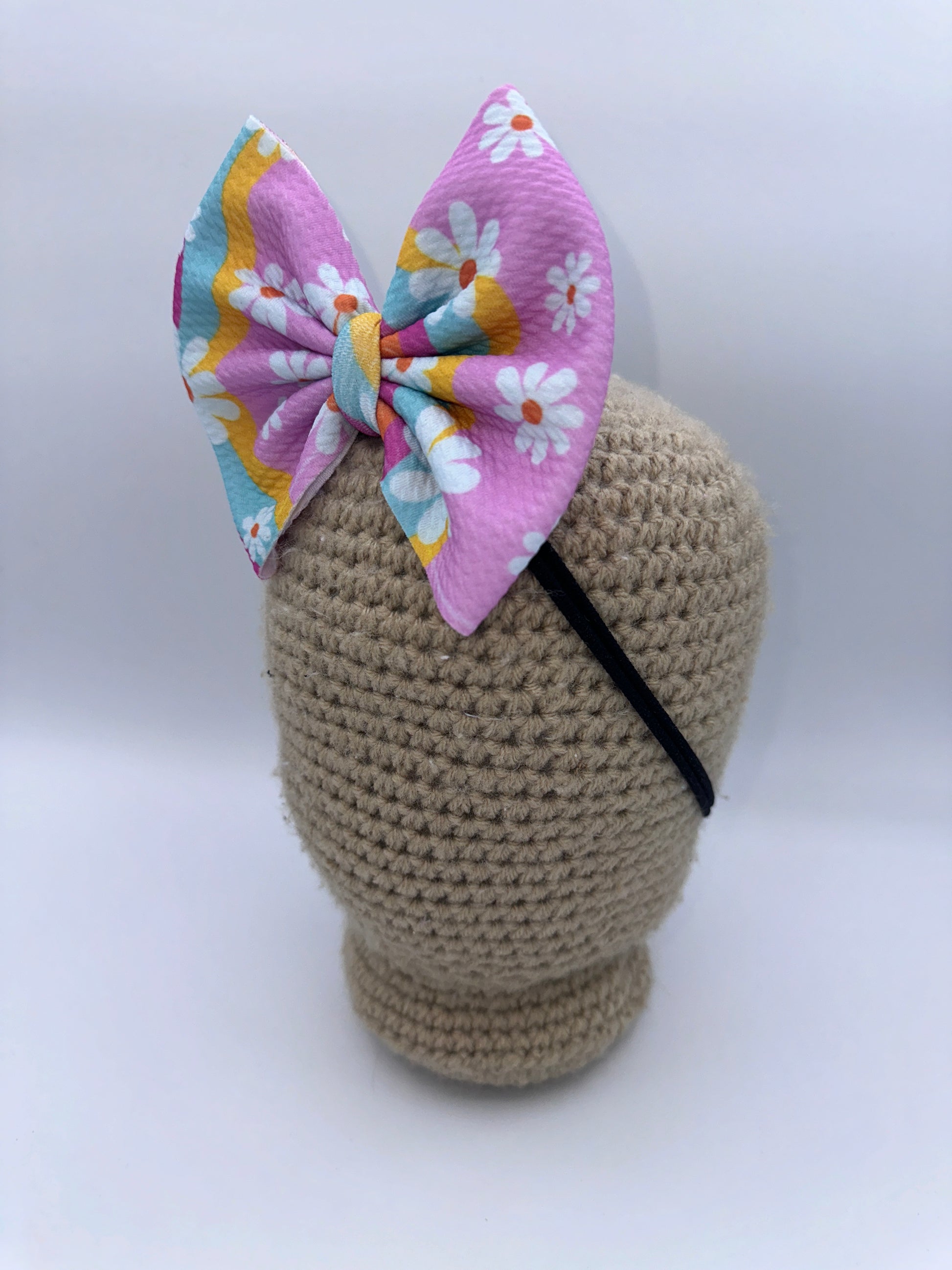 These bows are approximately 5 inches wide. You have the choice of the bow being on a 2.25 inch alligator clip or a stretchy nylon band . The nylon band is a one size fits all.
