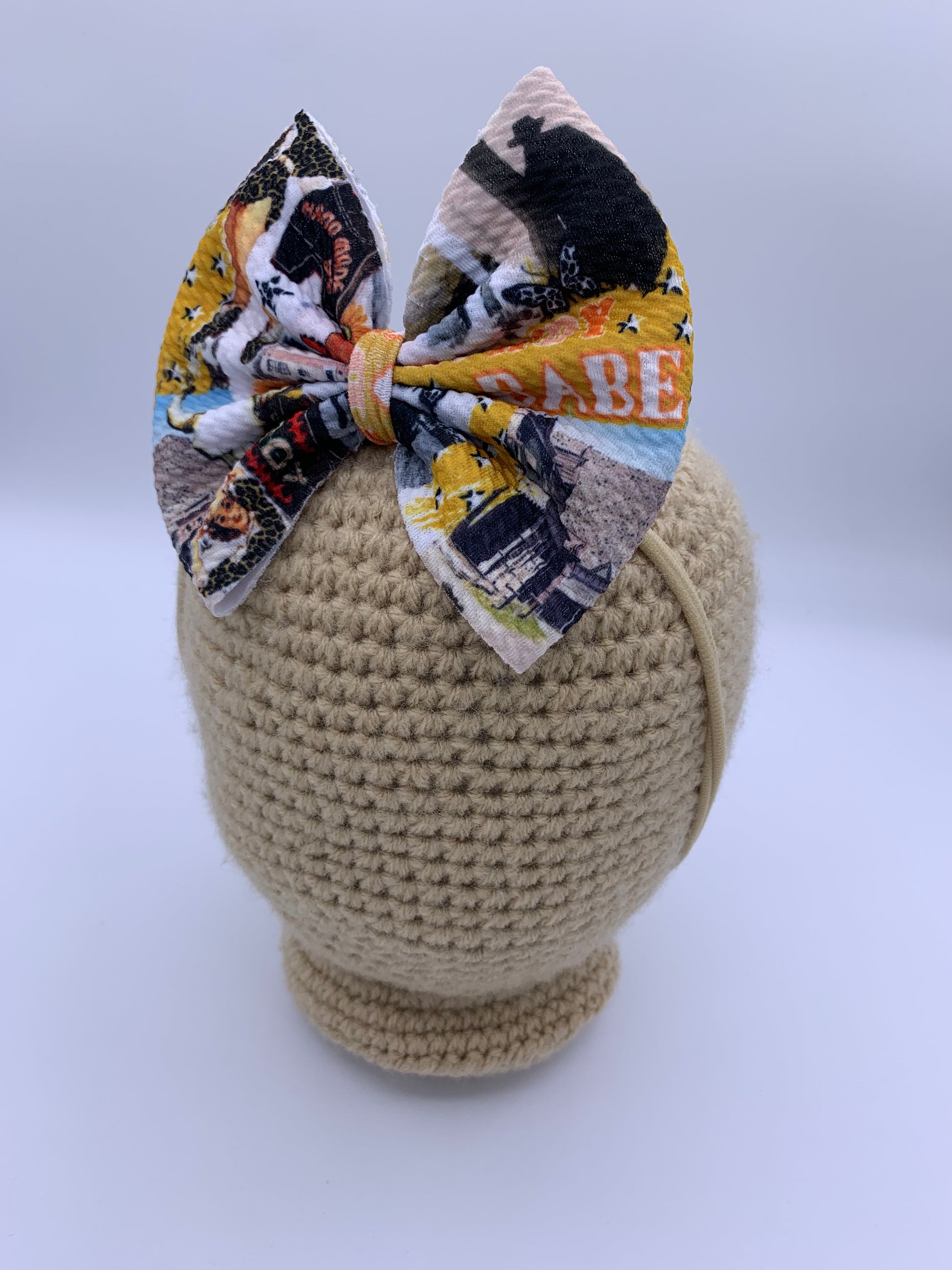 These bows are approximately 5 inches wide. You have the choice of the bow being on a 2.25 inch alligator clip or a stretchy nylon band . The nylon band is a one size fits all.