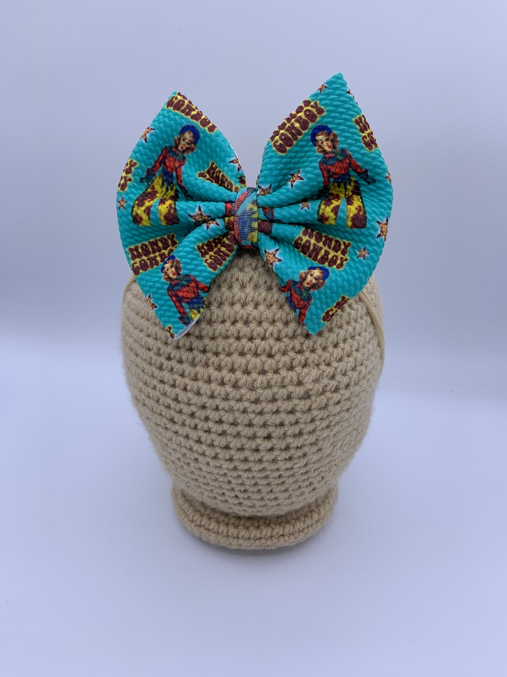 These bows are approximately 5 inches wide. You have the choice of the bow being on a 2.25 inch alligator clip or a stretchy nylon band . The nylon band is a one size fits all.