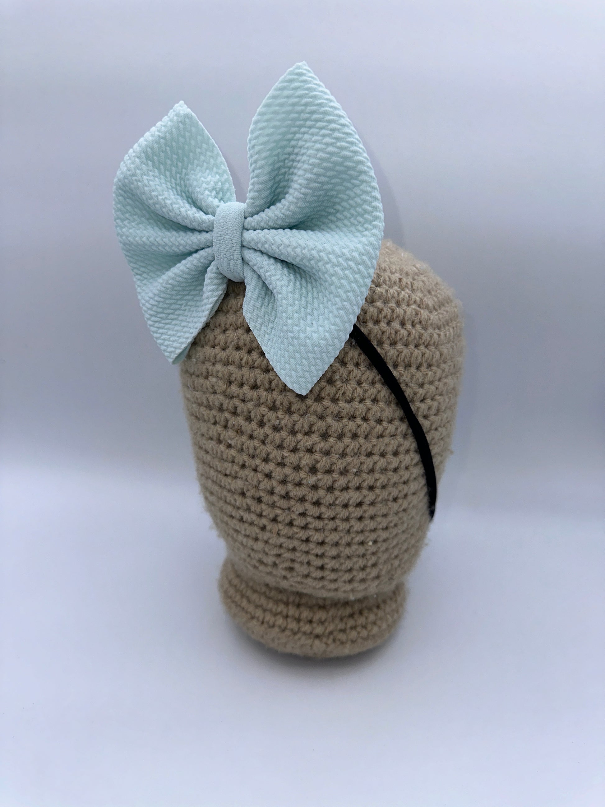 These bows are approximately 5 inches wide. You have the choice of the bow being on a 2.25 inch alligator clip or a stretchy nylon band . The nylon band is a one size fits all.