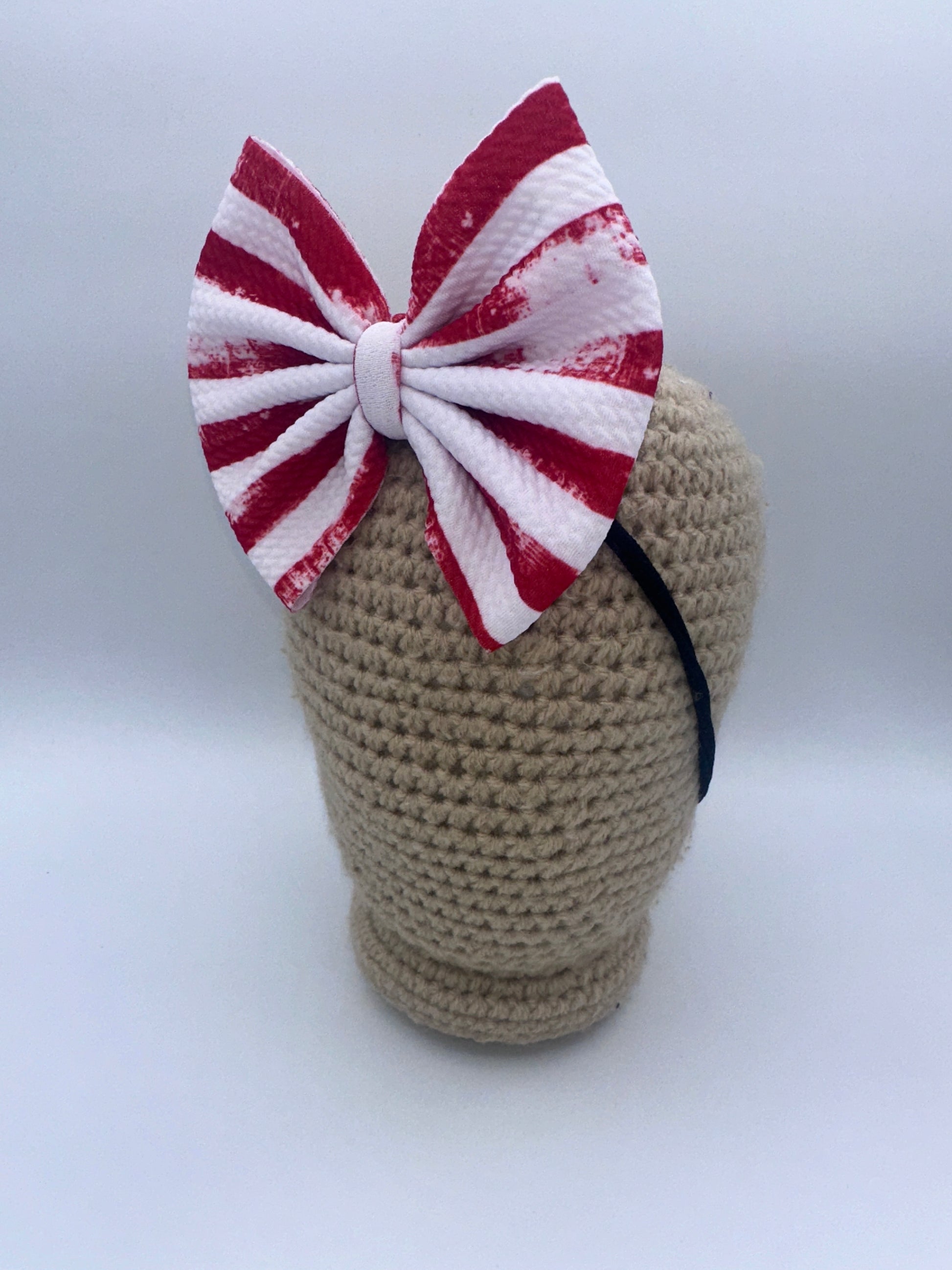 These bows are approximately 5 inches wide. You have the choice of the bow being on a 2.25 inch alligator clip or a stretchy nylon band . The nylon band is a one size fits all.