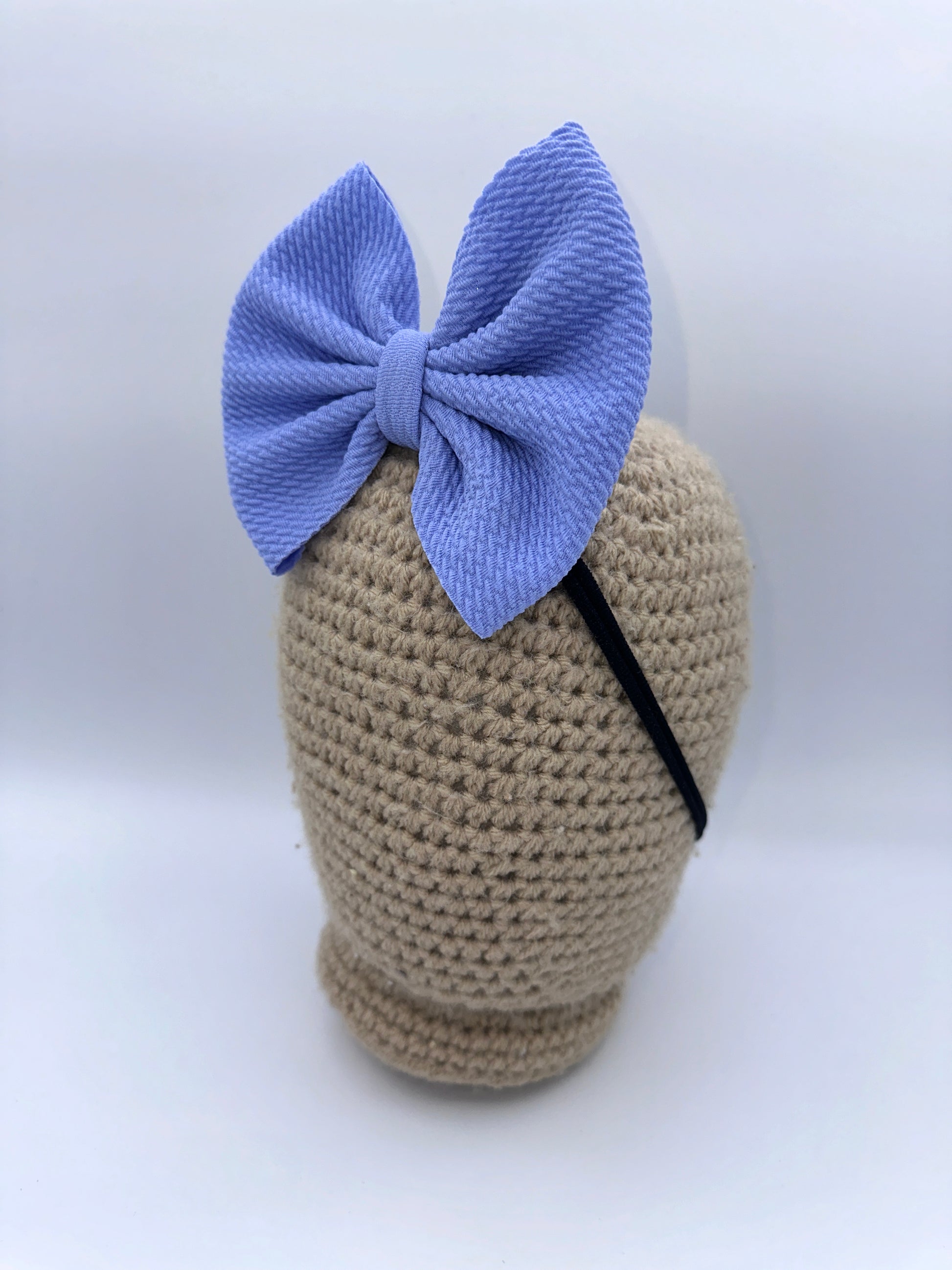 These bows are approximately 5 inches wide. You have the choice of the bow being on a 2.25 inch alligator clip or a stretchy nylon band . The nylon band is a one size fits all.