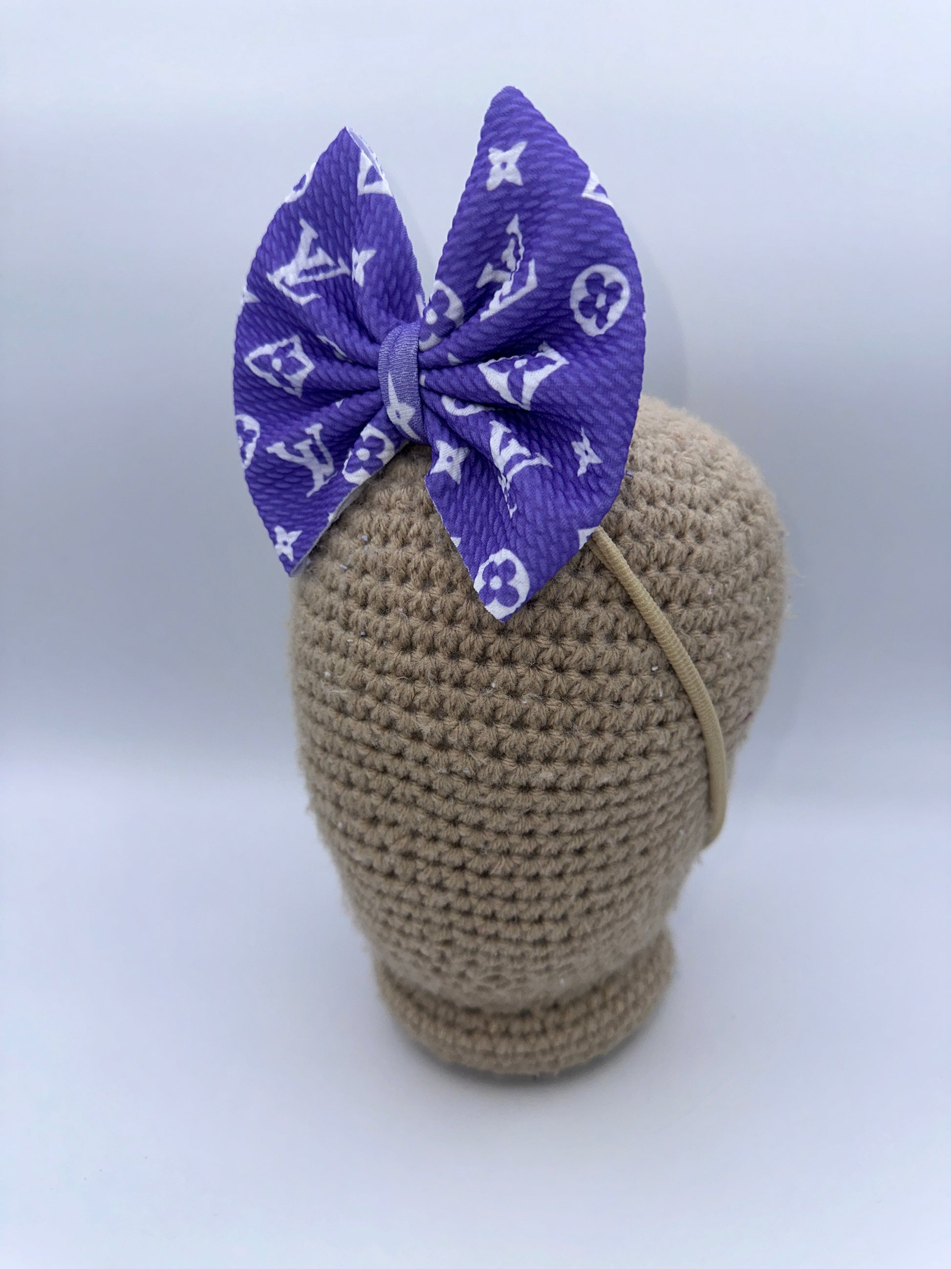 These bows are approximately 5 inches wide. You have the choice of the bow being on a 2.25 inch alligator clip or a stretchy nylon band . The nylon band is a one size fits all.