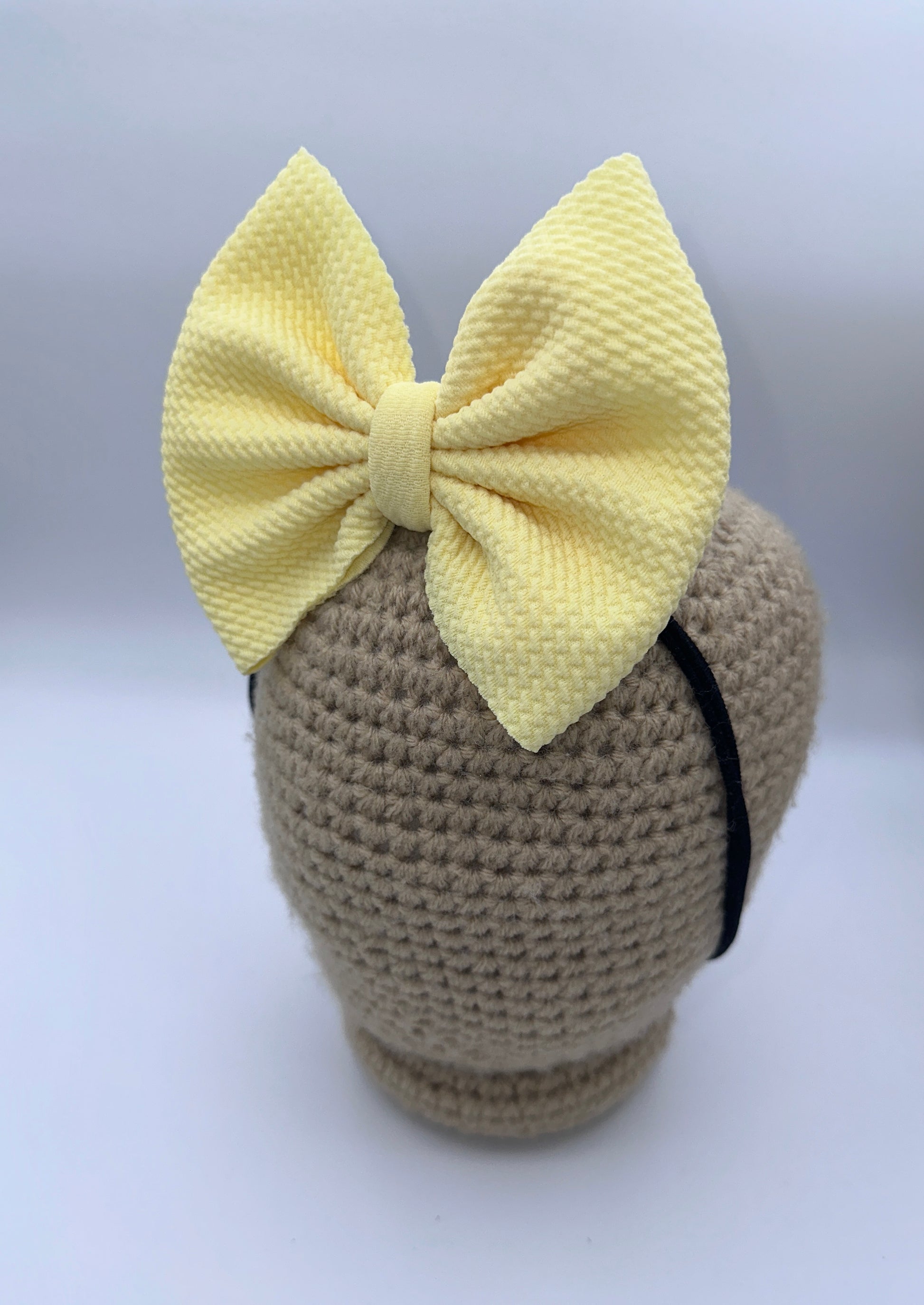 These bows are approximately 5 inches wide. You have the choice of the bow being on a 2.25 inch alligator clip or a stretchy nylon band . The nylon band is a one size fits all.