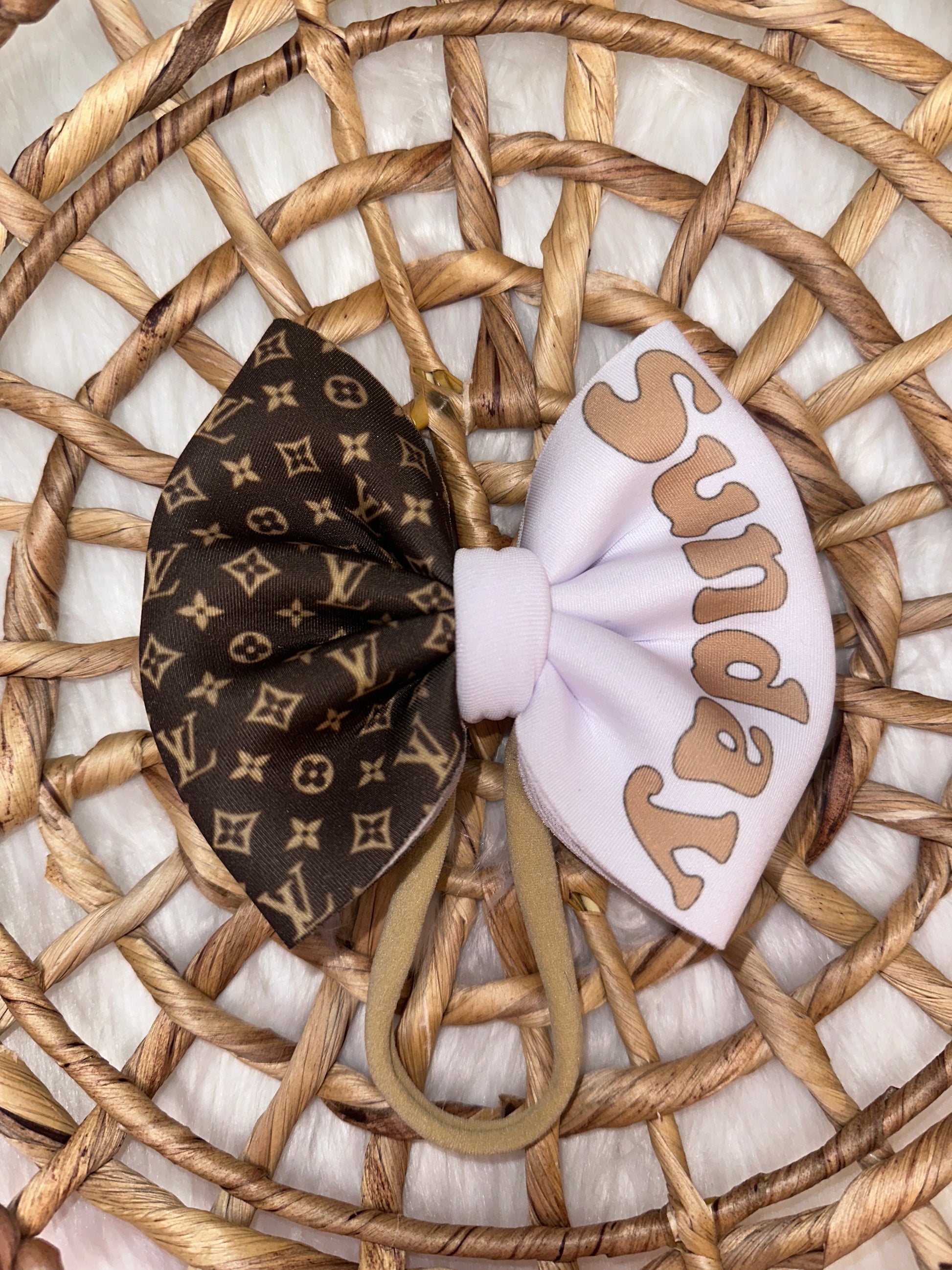 These bows are approximately 5 inches wide. You have the choice of the bow being on a 2.25 inch alligator clip or a stretchy nylon band . The nylon band is a one size fits all.