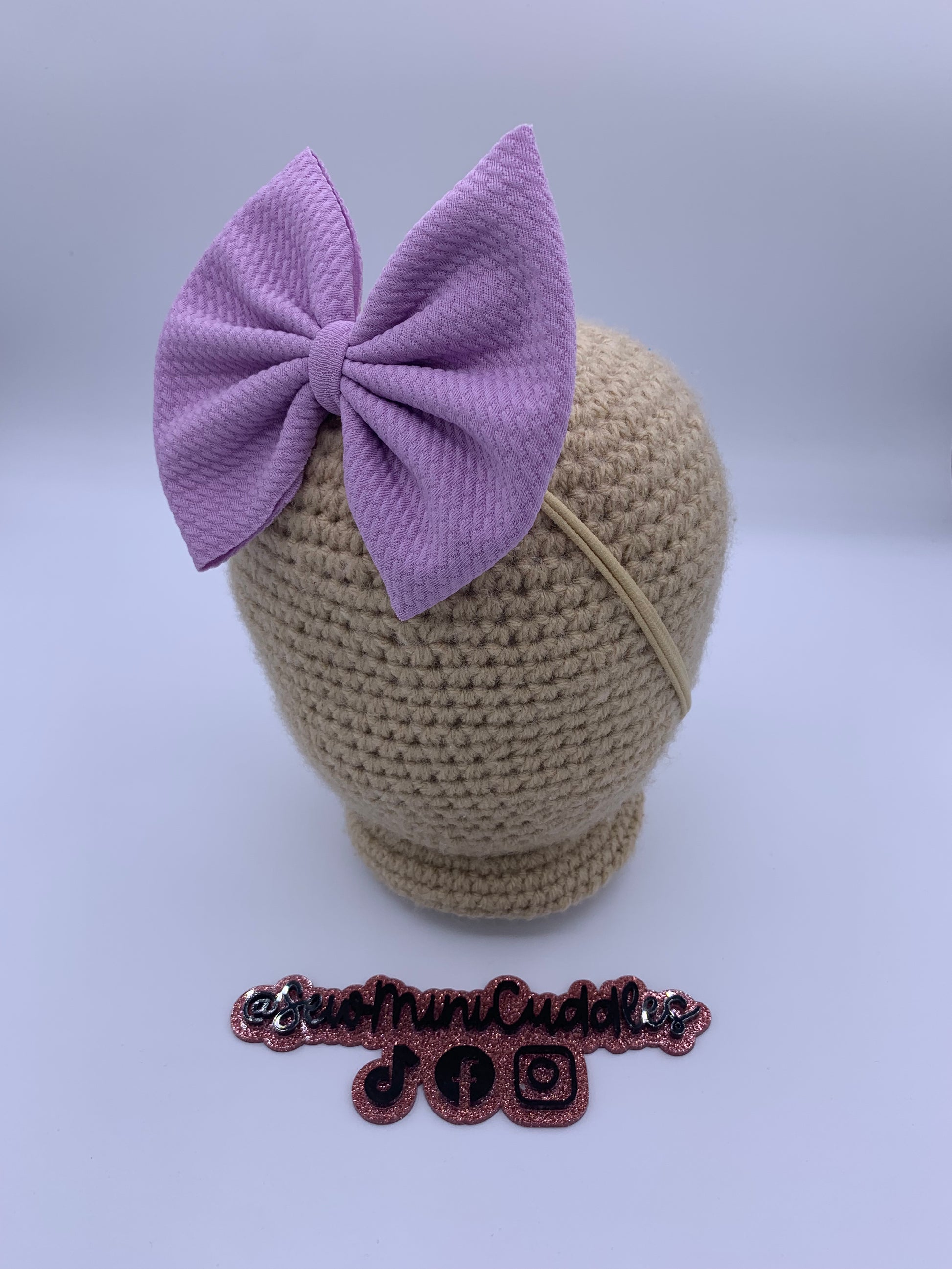 These bows are approximately 5 inches wide. You have the choice of the bow being on a 2.25 inch alligator clip or a stretchy nylon band . The nylon band is a one size fits all.