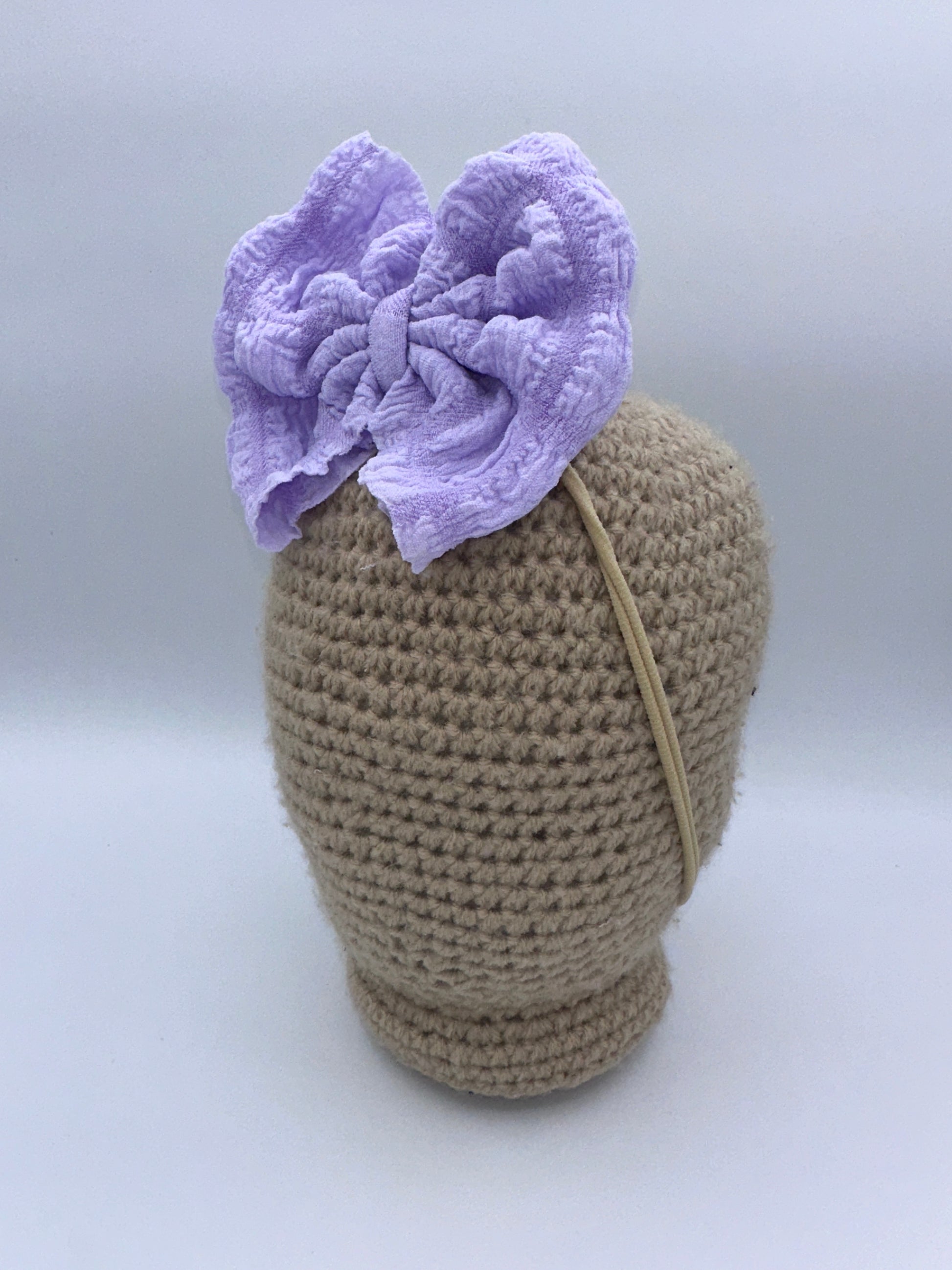 These bows are approximately 5 inches wide. You have the choice of the bow being on a 2.25 inch alligator clip or a stretchy nylon band . The nylon band is a one size fits all.