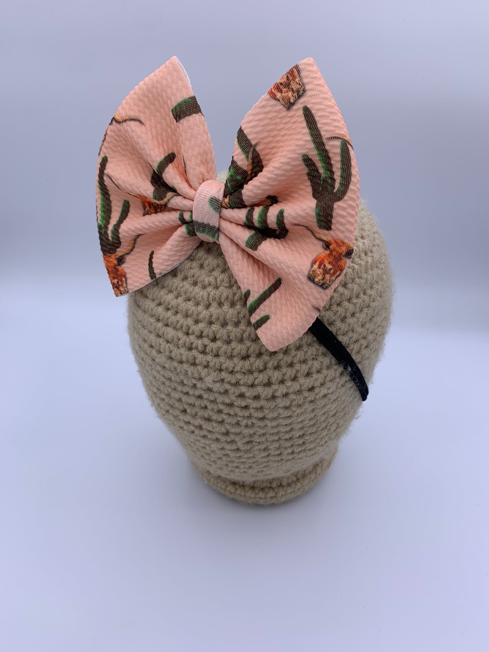 These bows are approximately 5 inches wide. You have the choice of the bow being on a 2.25 inch alligator clip or a stretchy nylon band . The nylon band is a one size fits all.