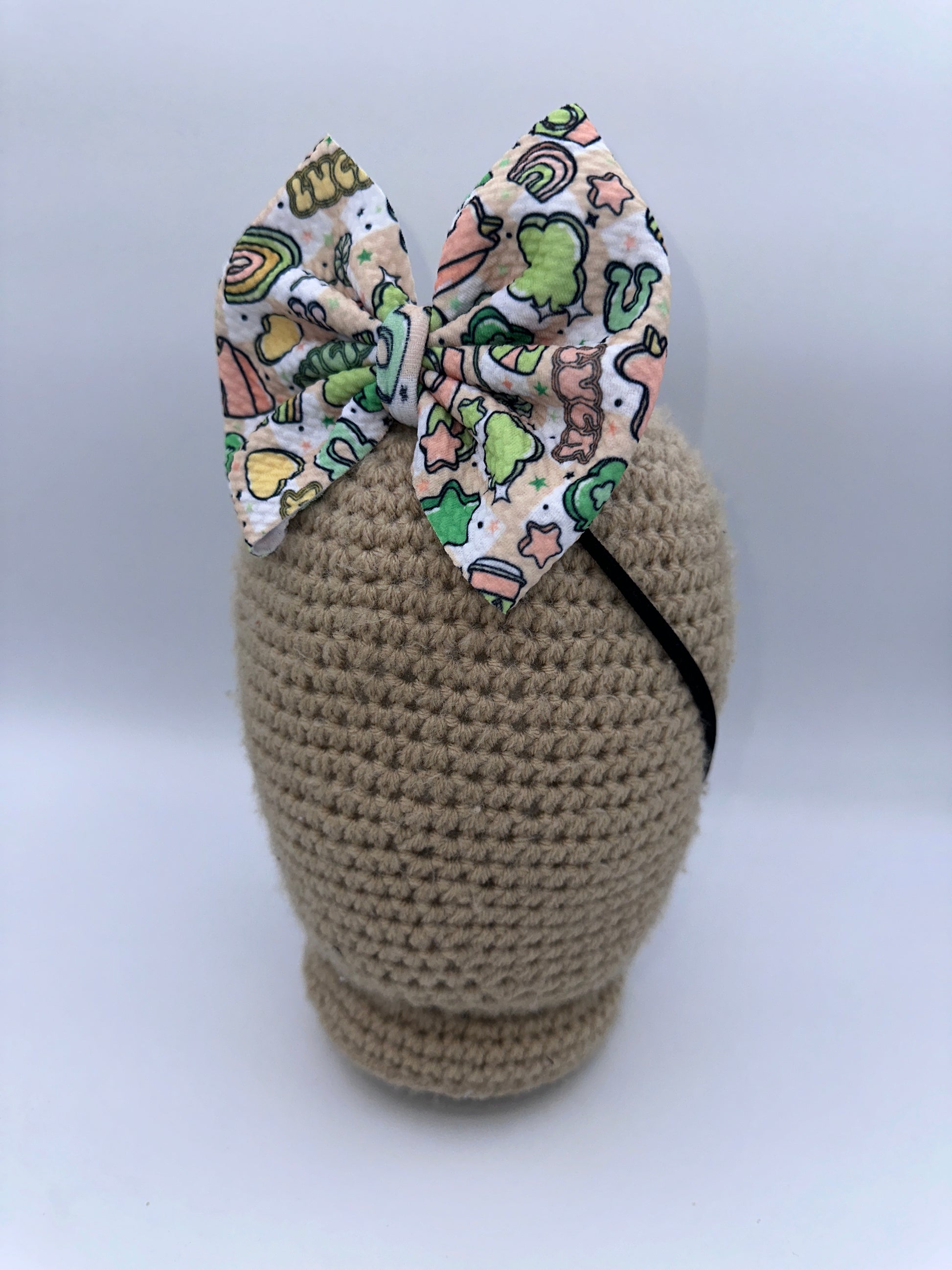 These bows are approximately 5 inches wide. You have the choice of the bow being on a 2.25 inch alligator clip or a stretchy nylon band . The nylon band is a one size fits all.