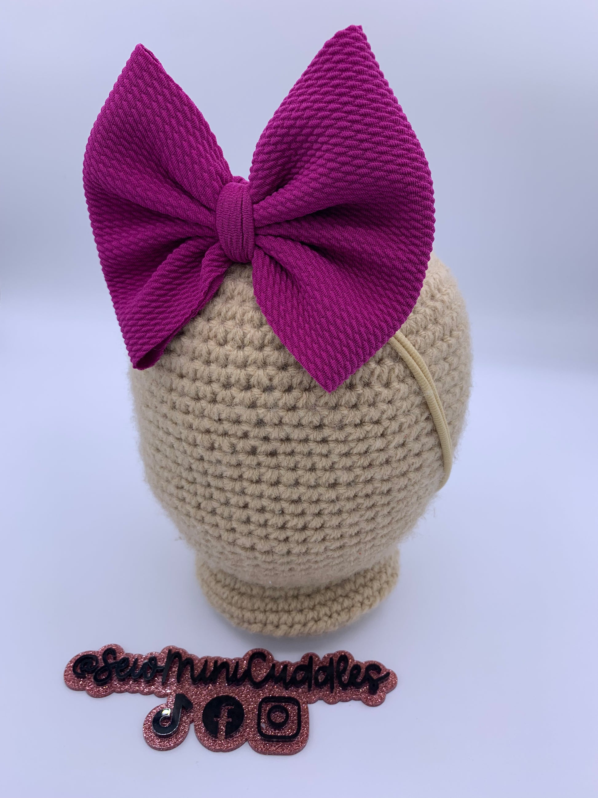 These bows are approximately 5 inches wide. You have the choice of the bow being on a 2.25 inch alligator clip or a stretchy nylon band . The nylon band is a one size fits all.