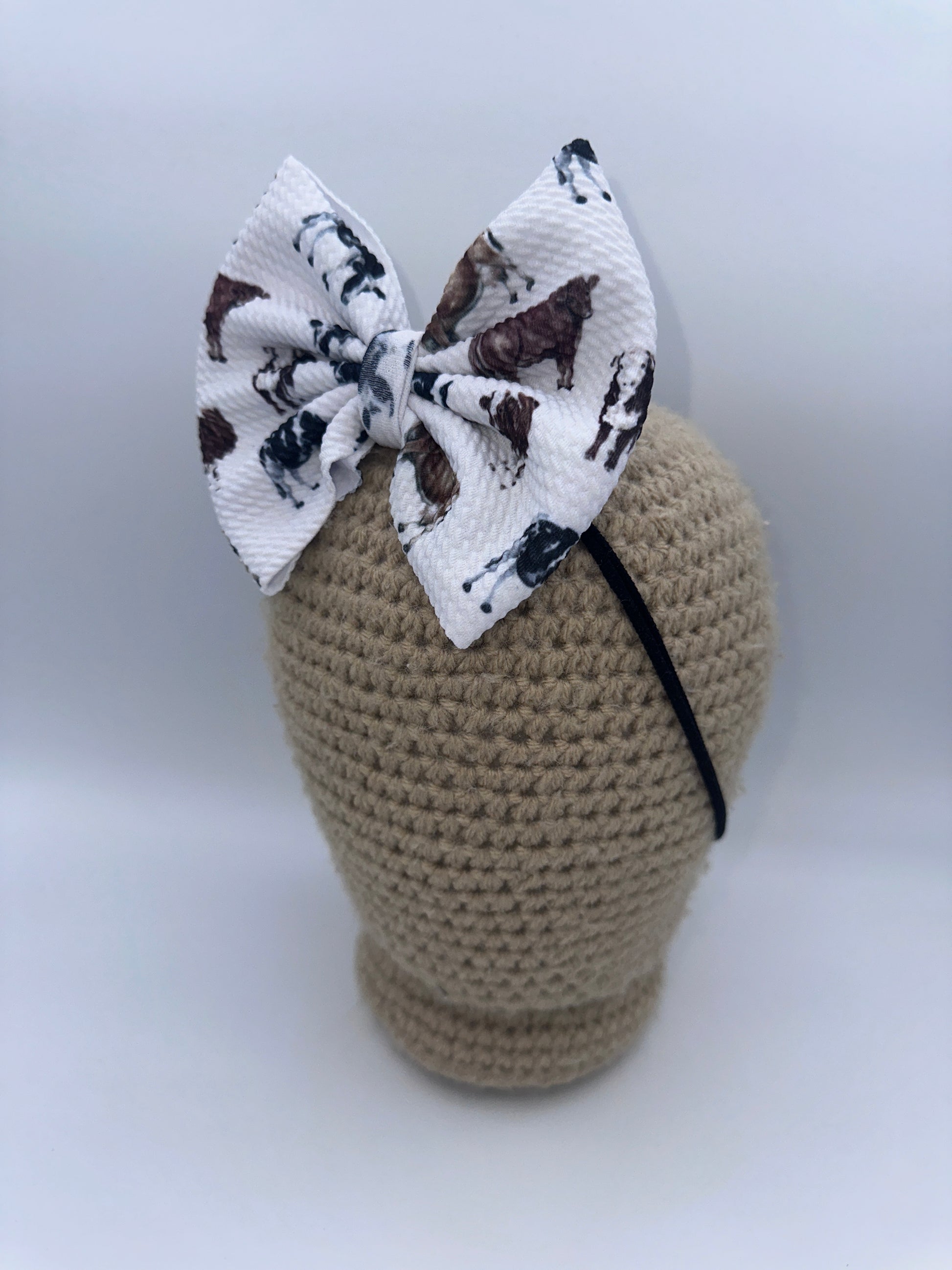 These bows are approximately 5 inches wide. You have the choice of the bow being on a 2.25 inch alligator clip or a stretchy nylon band . The nylon band is a one size fits all.