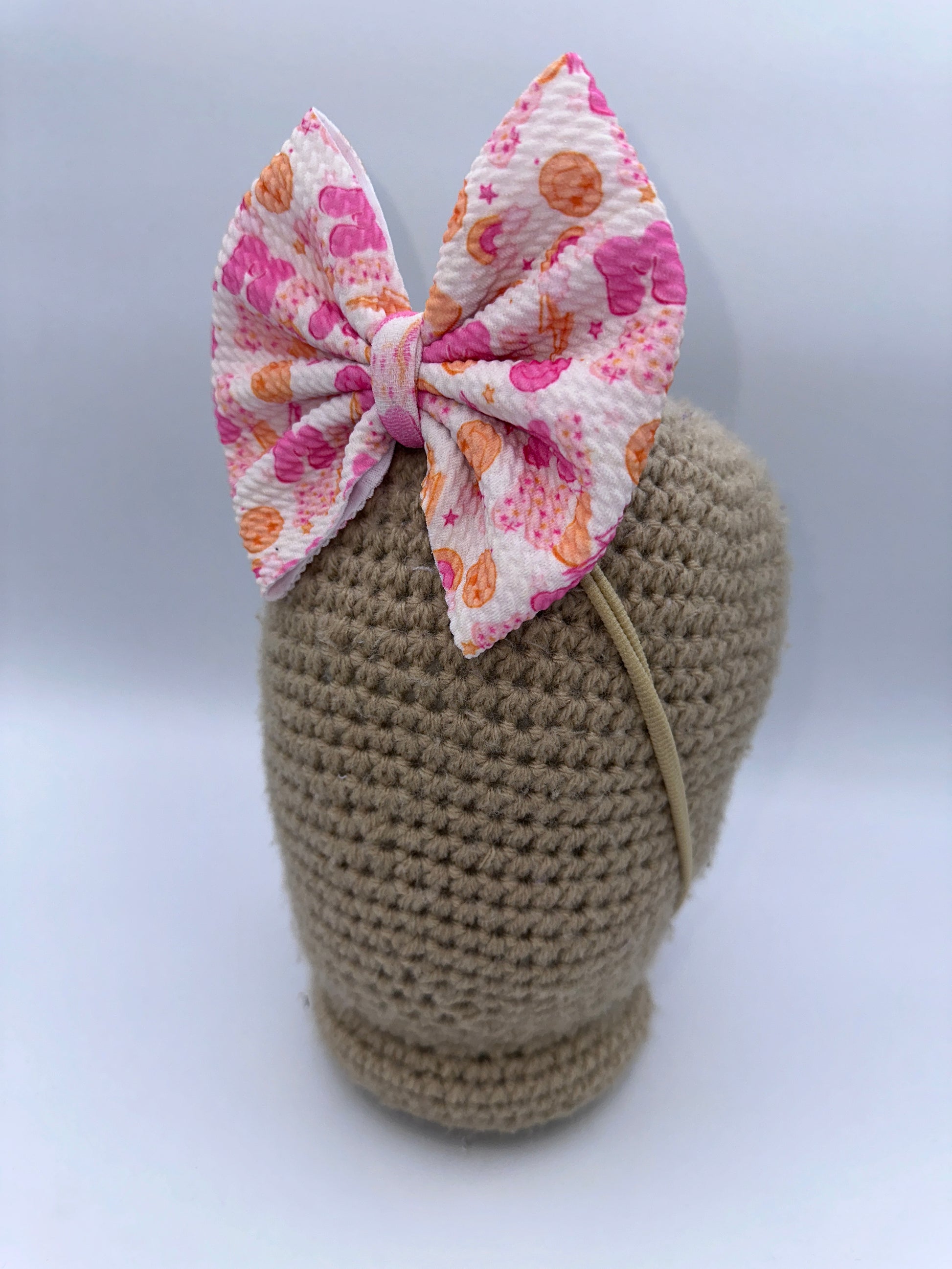 These bows are approximately 5 inches wide. You have the choice of the bow being on a 2.25 inch alligator clip or a stretchy nylon band . The nylon band is a one size fits all.