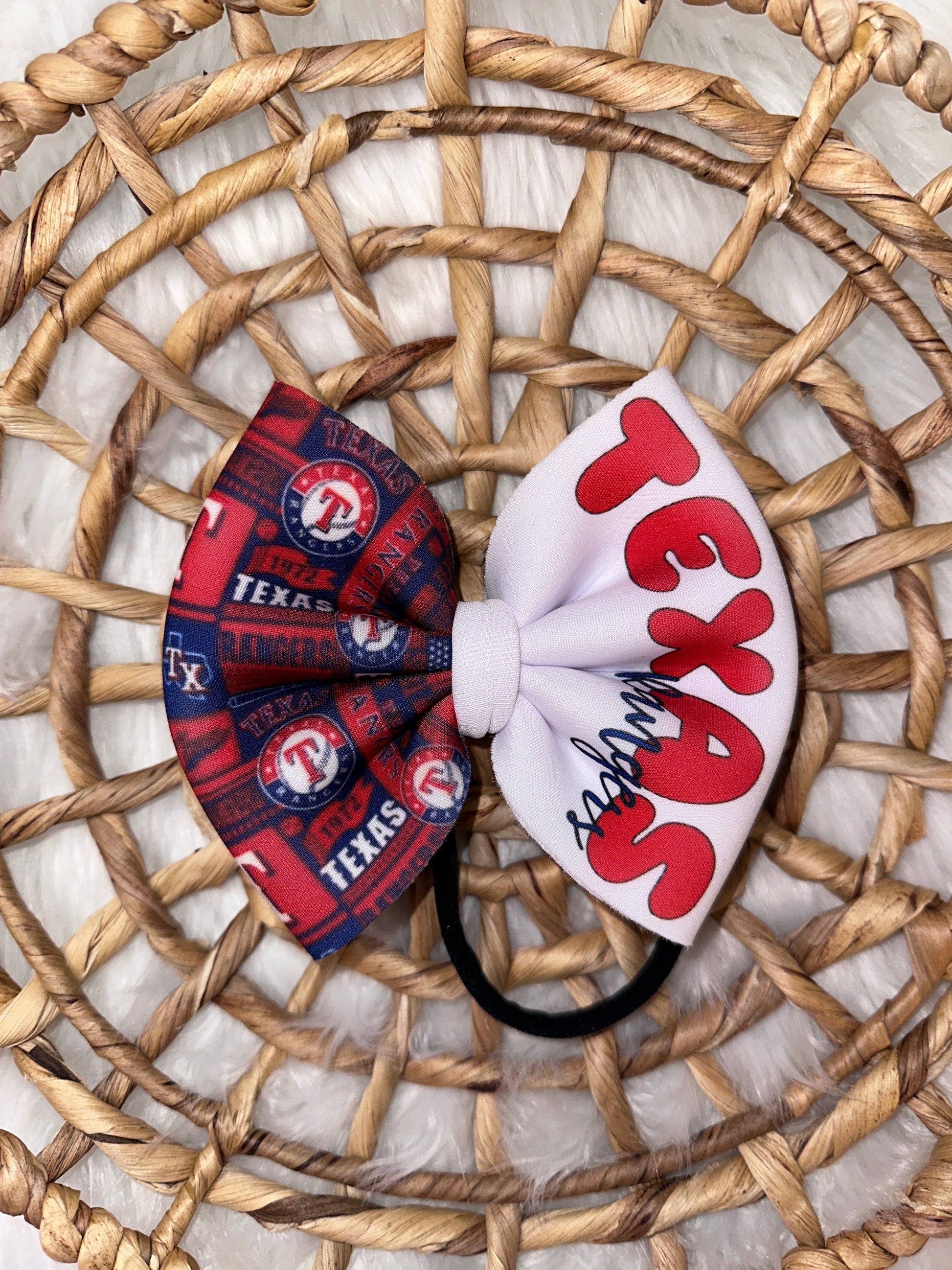 These bows are approximately 5 inches wide. You have the choice of the bow being on a 2.25 inch alligator clip or a stretchy nylon band . The nylon band is a one size fits all.