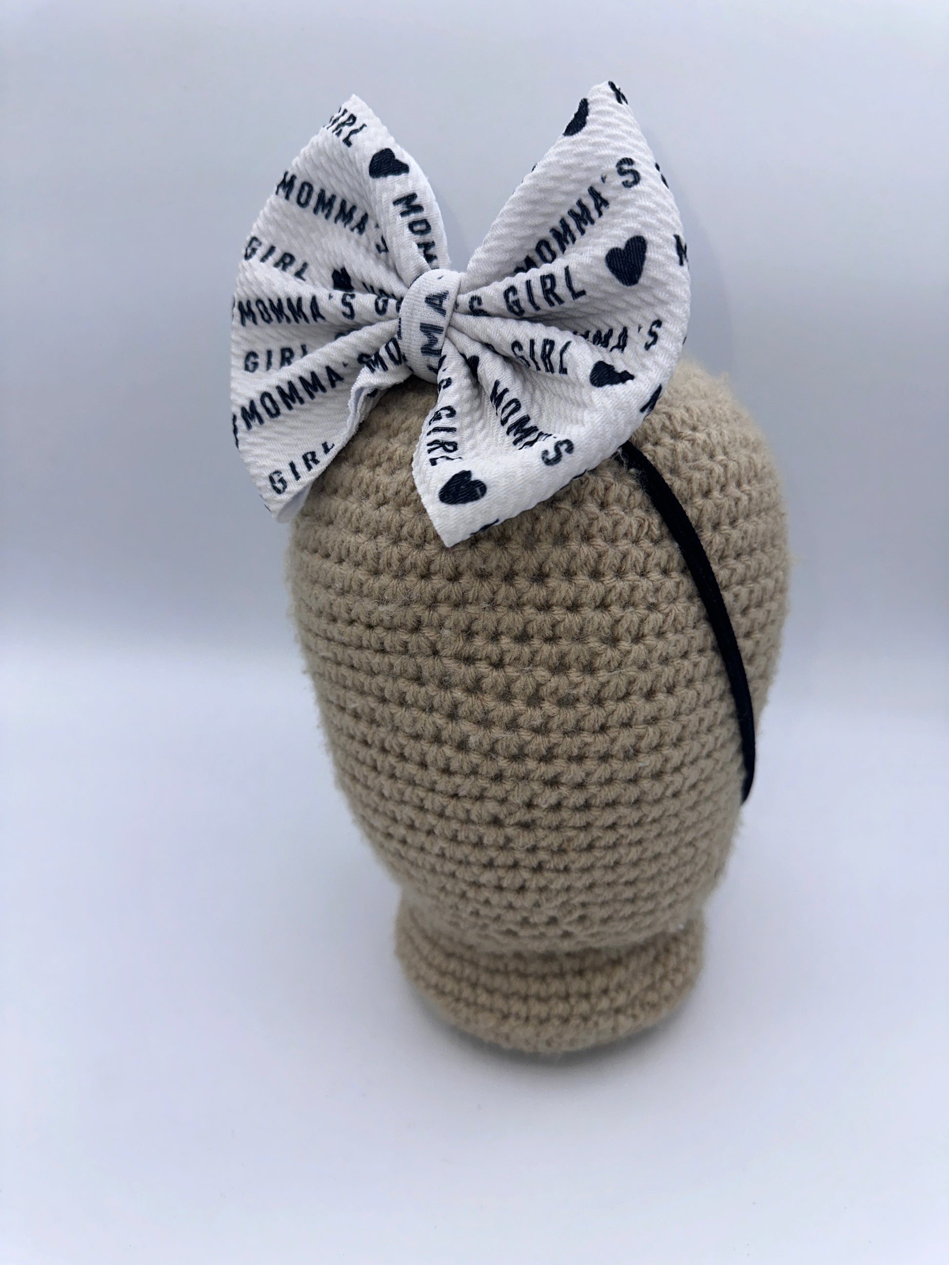 These bows are approximately 5 inches wide. You have the choice of the bow being on a 2.25 inch alligator clip or a stretchy nylon band . The nylon band is a one size fits all.