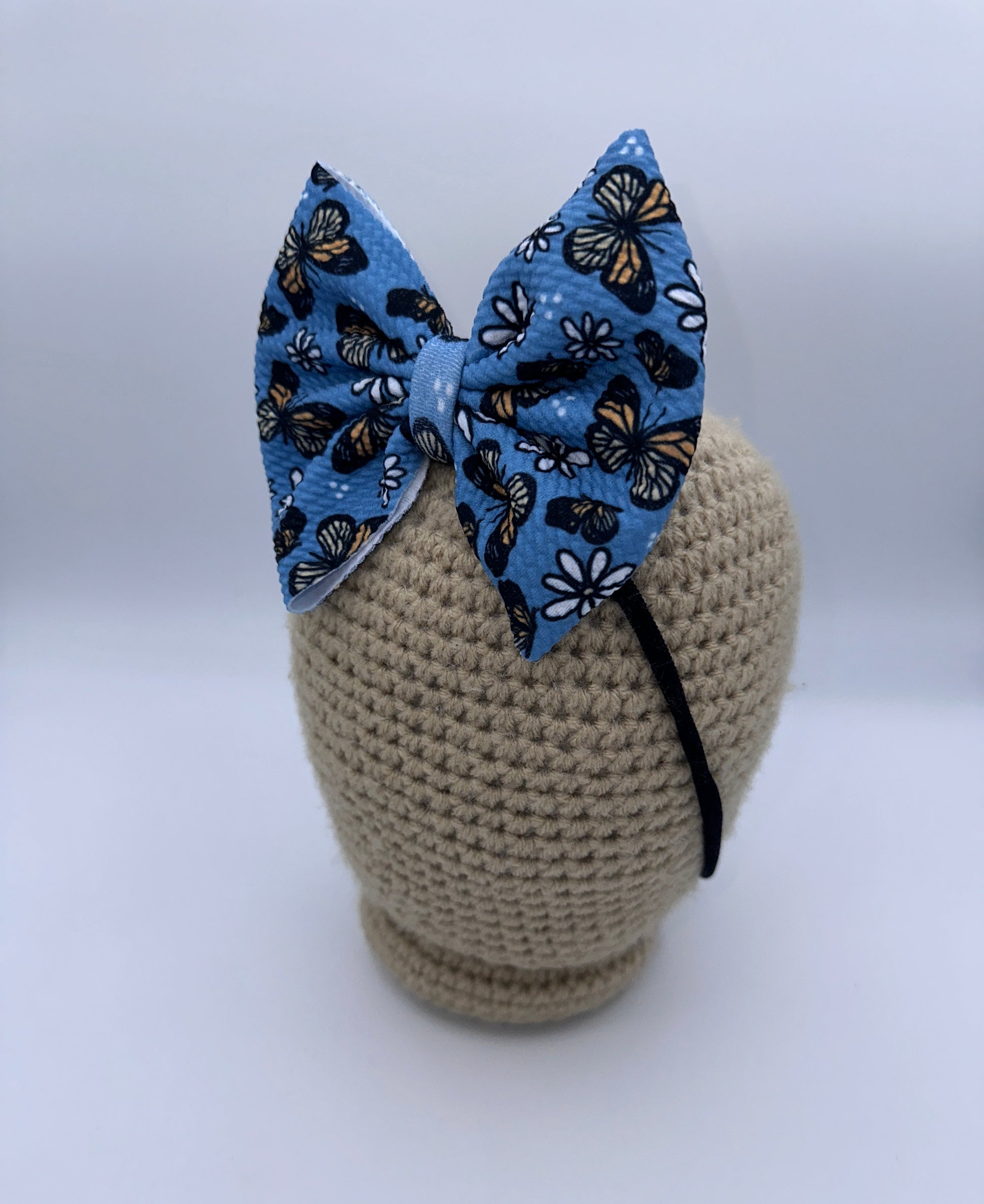 These bows are approximately 5 inches wide. You have the choice of the bow being on a 2.25 inch alligator clip or a stretchy nylon band . The nylon band is a one size fits all.