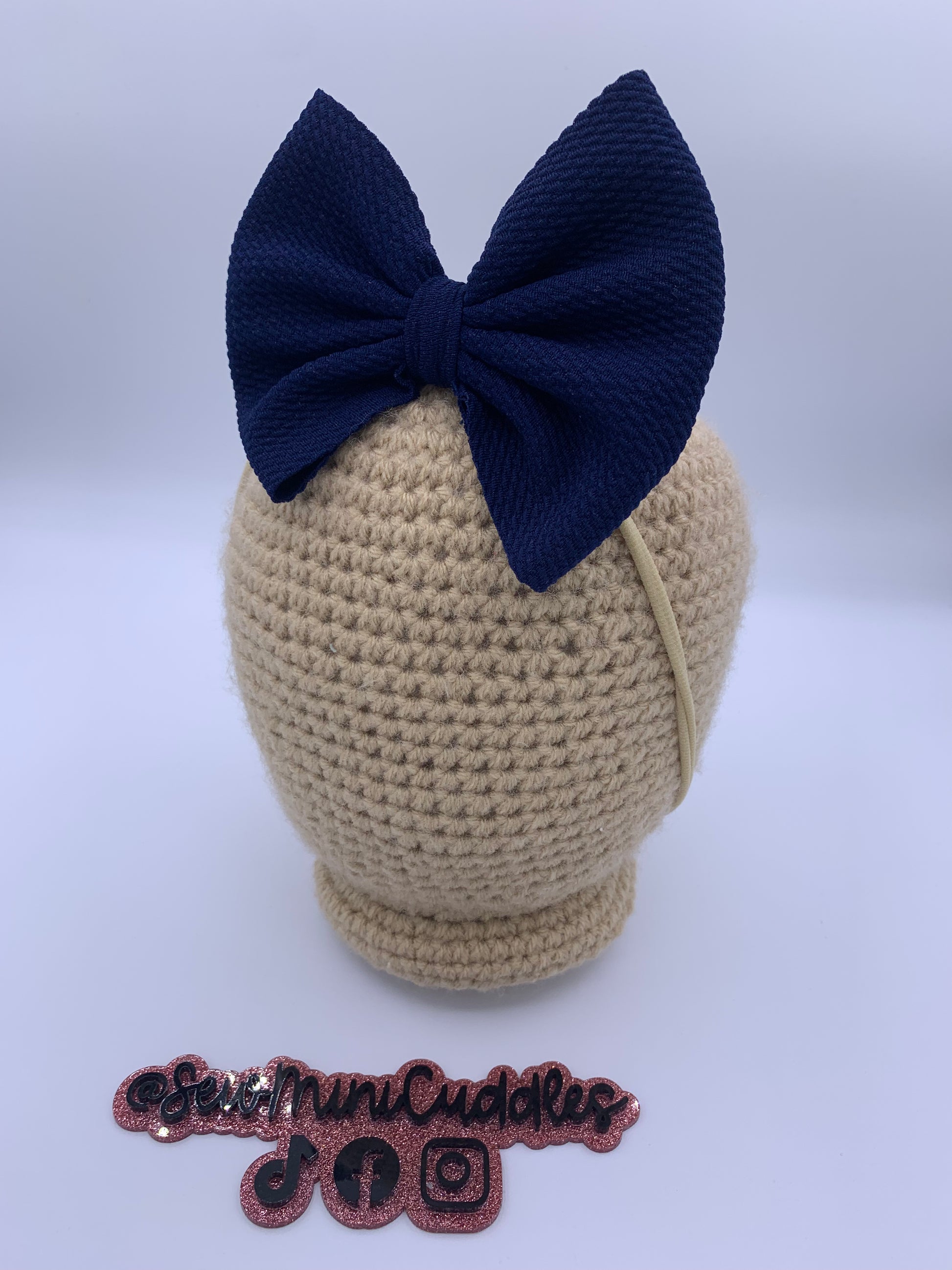 These bows are approximately 5 inches wide. You have the choice of the bow being on a 2.25 inch alligator clip or a stretchy nylon band . The nylon band is a one size fits all.