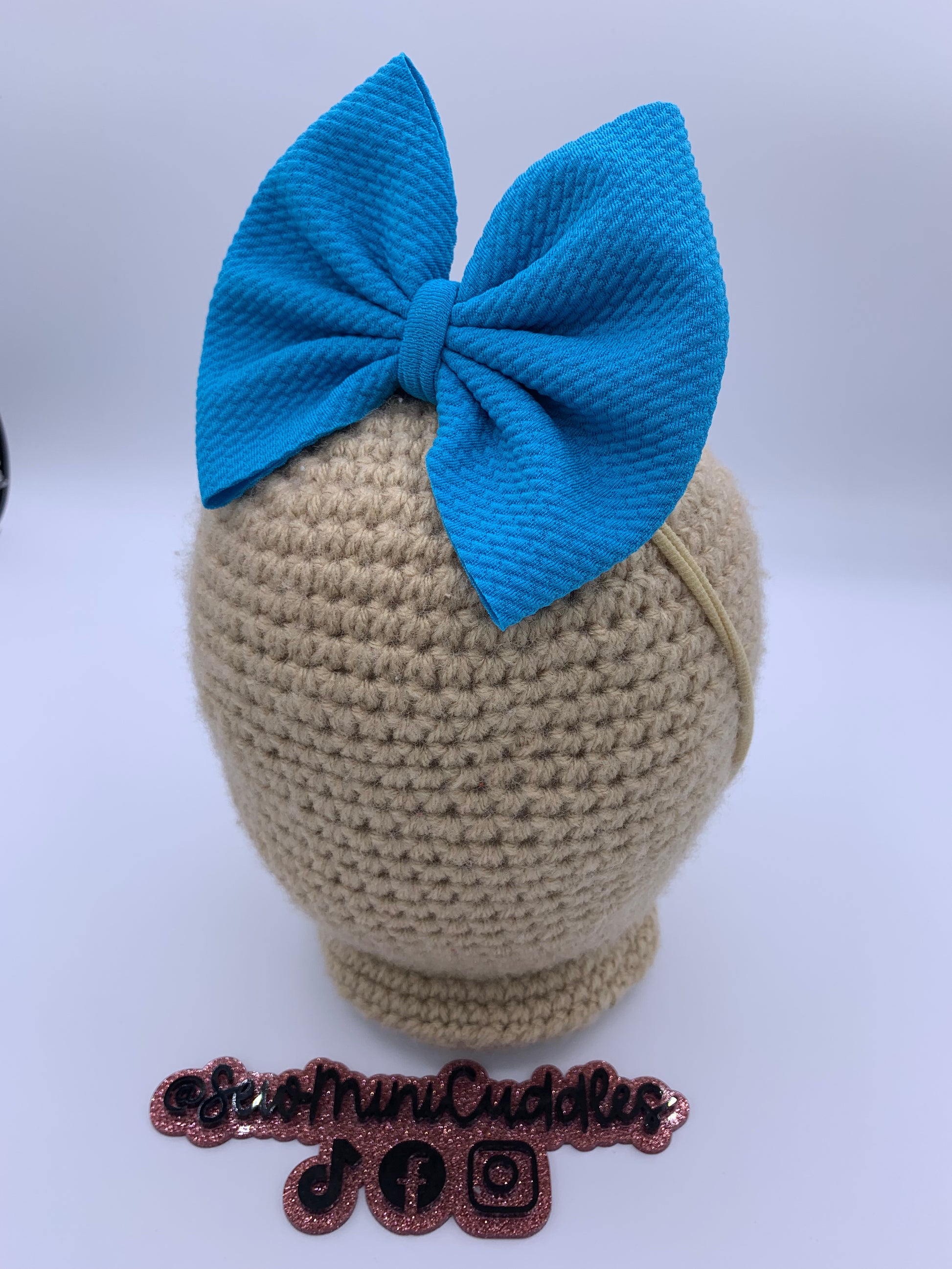 These bows are approximately 5 inches wide. You have the choice of the bow being on a 2.25 inch alligator clip or a stretchy nylon band . The nylon band is a one size fits all.
