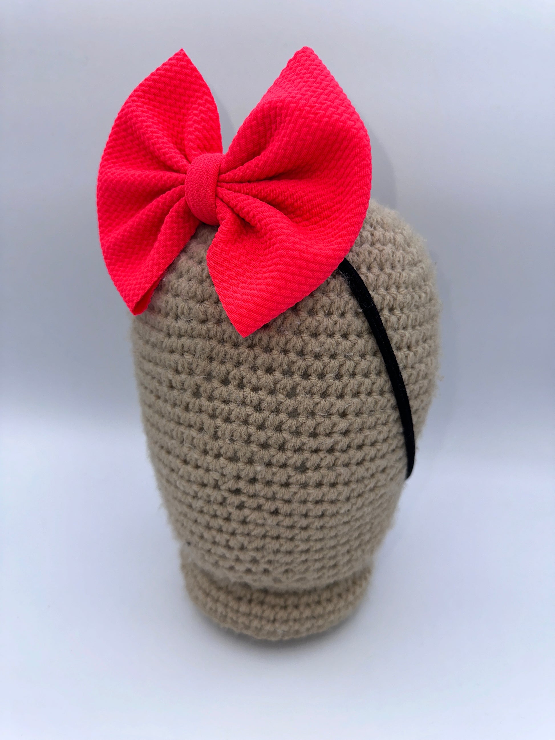 These bows are approximately 5 inches wide. You have the choice of the bow being on a 2.25 inch alligator clip or a stretchy nylon band . The nylon band is a one size fits all.